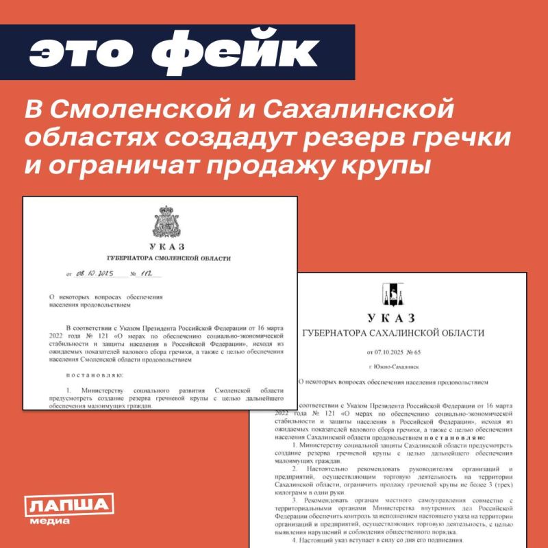 Так, документы о создании резерва крупы и ограничении его продажи до 3 кг. в одни руки на этот раз появились в Сахалинской и Смоленской областях.Документы являются подделкой, а речи о нехватке крупы в России не идет. Минсельхоз...