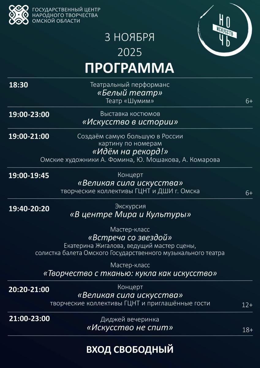 3 ноября в 18.30 гостей ждет перформанс театра «Шумим», выставки сценического и этнокостюма. Большую музыкальную программу «Великая сила искусства» представят творческие коллективы ГЦНТ, детские школы искусств Омска и приглашенные артистов.