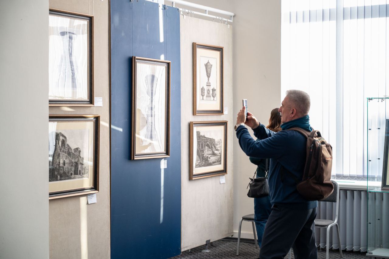 Основу выставки составляют гравюры итальянского архитектора и художника-графика Пиранези. Монументальные здания античного Рима, приукрашенные фантазией художника, напоминают останки величественной цивилизации. Кроме знаменитого Пиранези, экспозицию дополняют произведения Луиджи Россини, Джузеппе Вази и других известных граверов того времени.