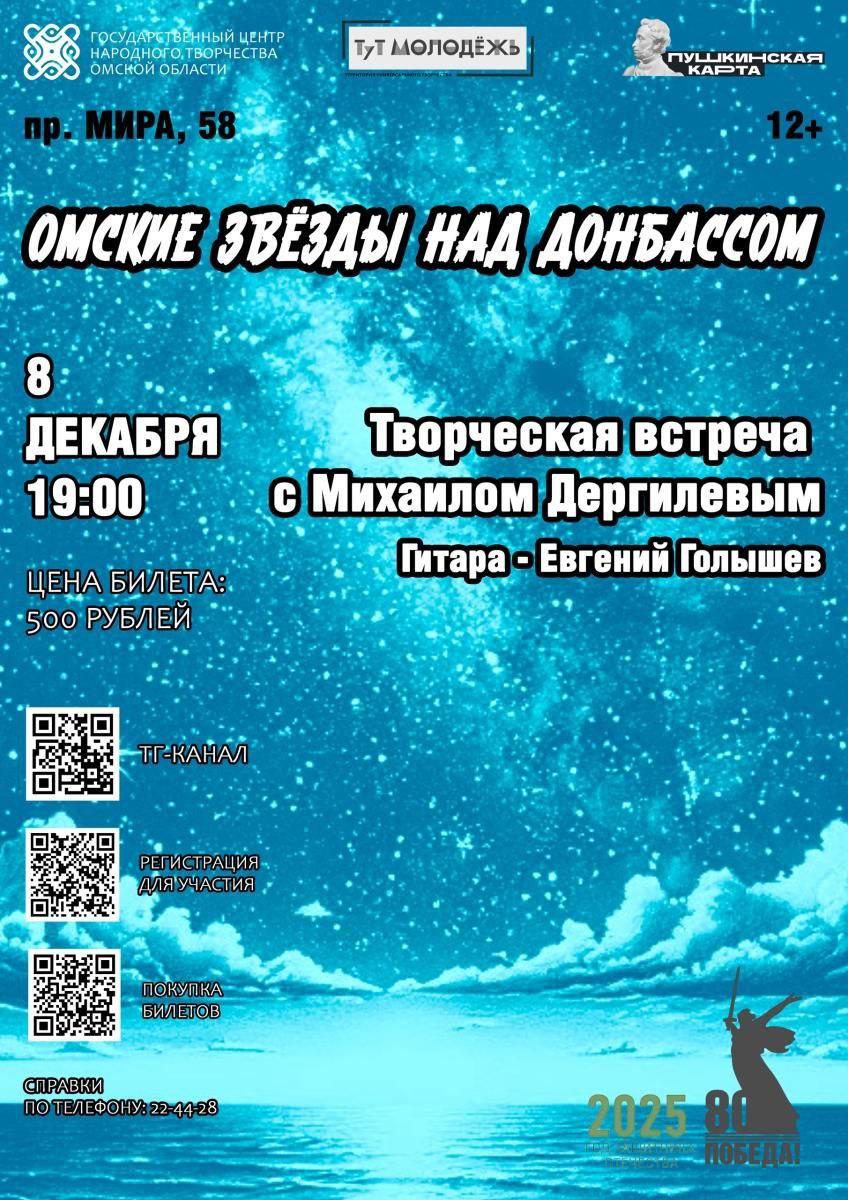 Сегодня - 8 декабря в 19.00 в рамках проекта "ТУТ молодежь" в Государственном центре народного творчества (пр. Мира, 58) состоится творческая встреча "Омские звезды над Донбассом" с ведущим мастером сцены, режиссером-постановщиком Омского государственного музыкального театра, автором моноспектакля "Записки о СВОих" Михаилом Дергилевым. Звукорежиссер — Евгений Голышев.
