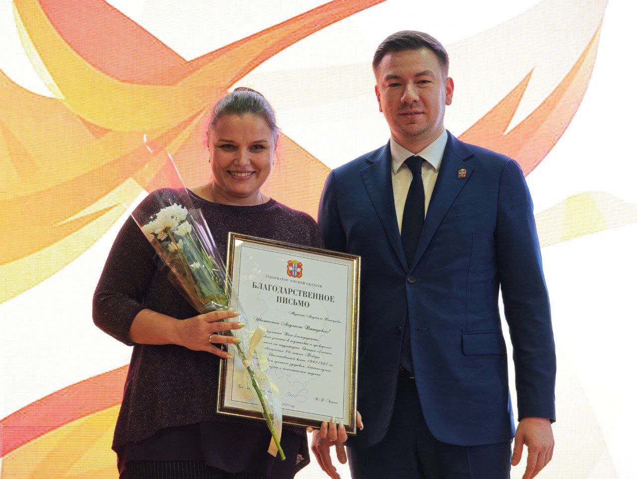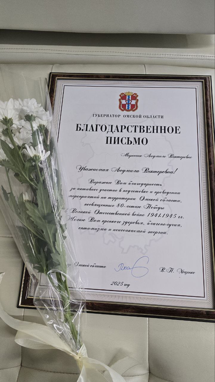 Благодарственное письмо губернатора Омской области Виталия Хоценко за активное участие в подготовке и проведении мероприятий на территории Омской области, посвященных 80-летию Победы в Великой Отечественной войне 1941-1945 годов, вручено пресс-секретарю Министерства культуры Омской области Людмиле Мирончик.