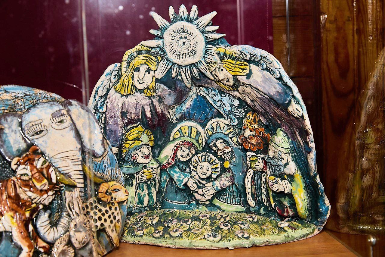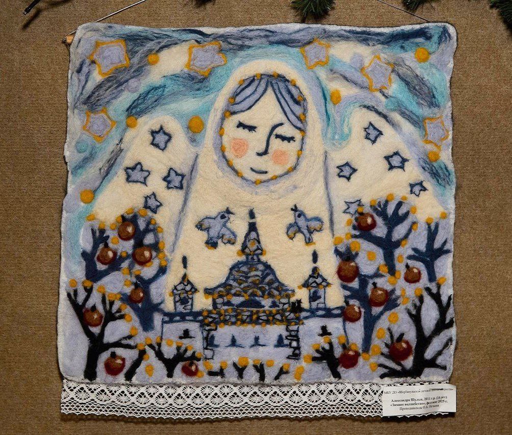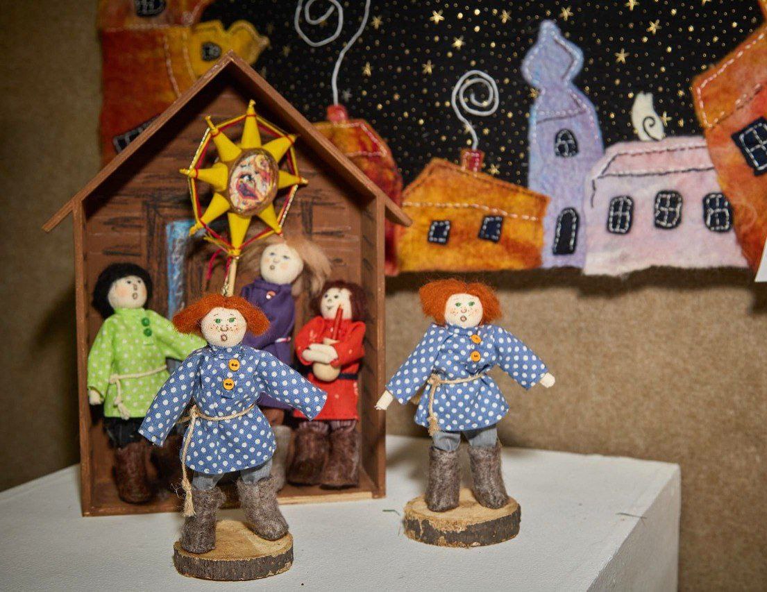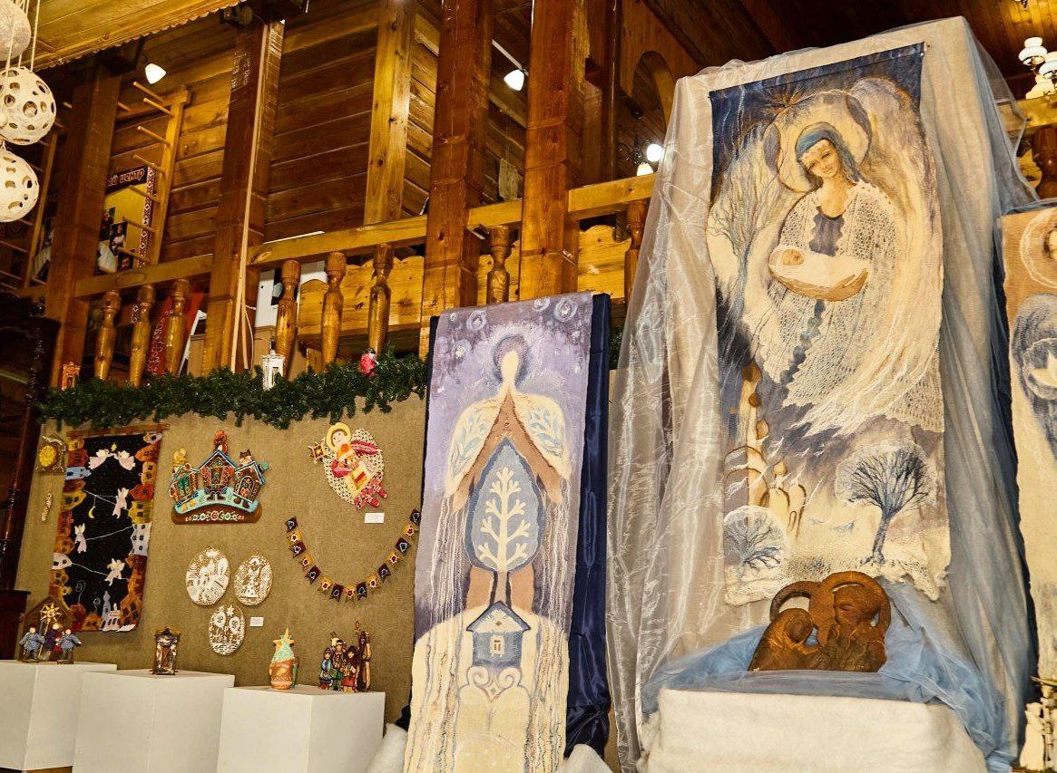 Среди экспонатов — предметы с урало-сибирской росписью, уникальные шерстяные панно, созданные в техниках сухого и мокрого валяния, искусно выполненные ватные игрушки, керамические изделия, а также народные куклы из текстиля и природных материалов, передающие традиционные образы Рождества и Святок.