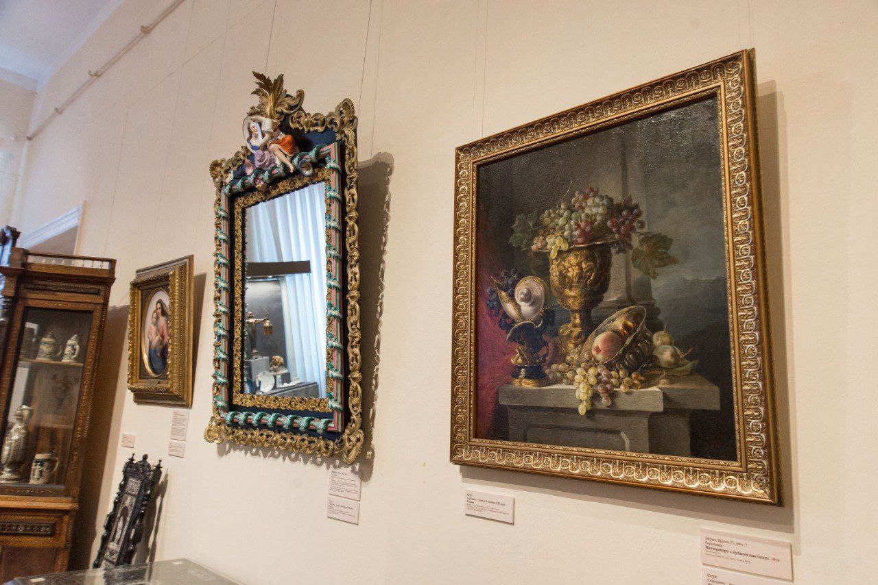 В экспозицию входят свыше 250 предметов декоративно-прикладного искусства (мебель, зеркала, часы, вазы, посуда, канделябры – изделия из фарфора, стекла, металла, камня, дерева, кости), а также живописные и графические работы, скульптура.