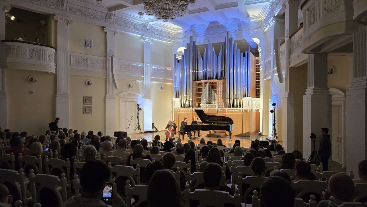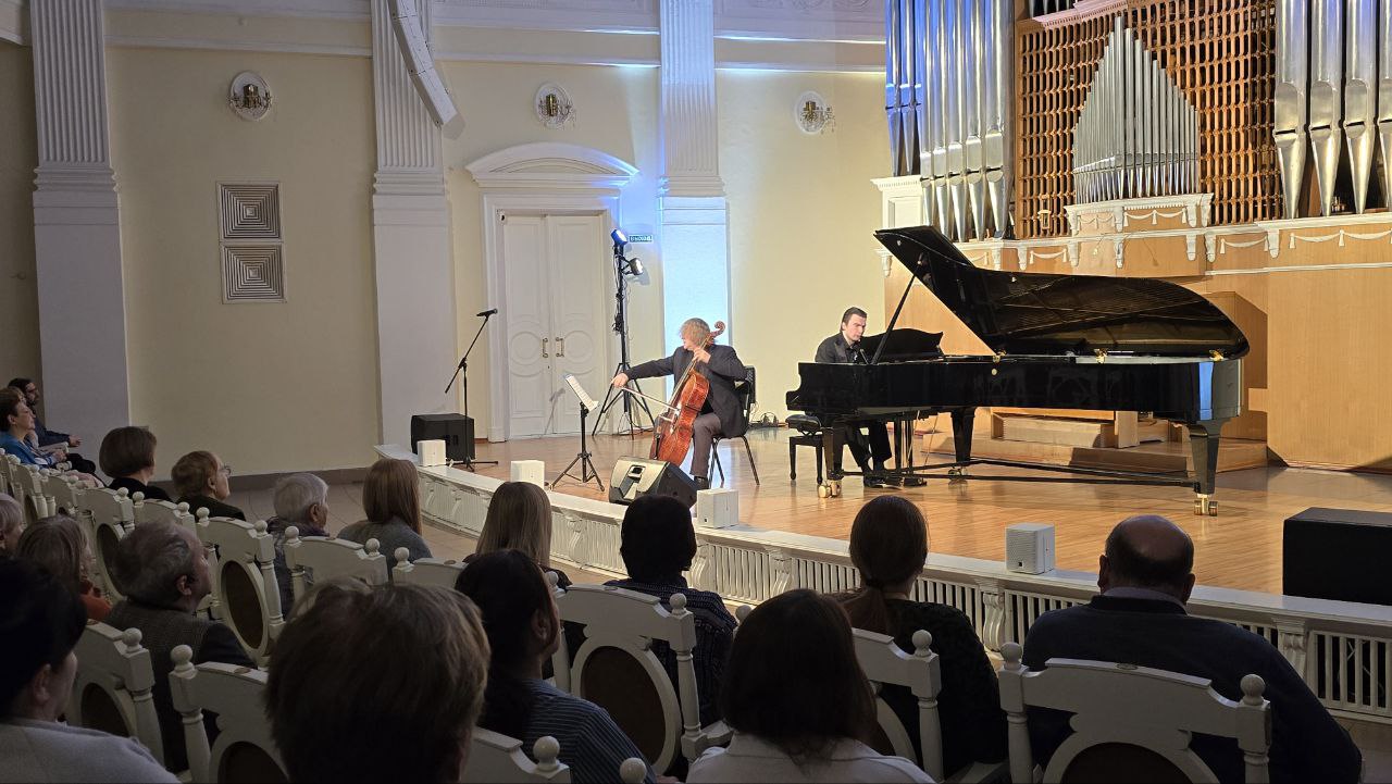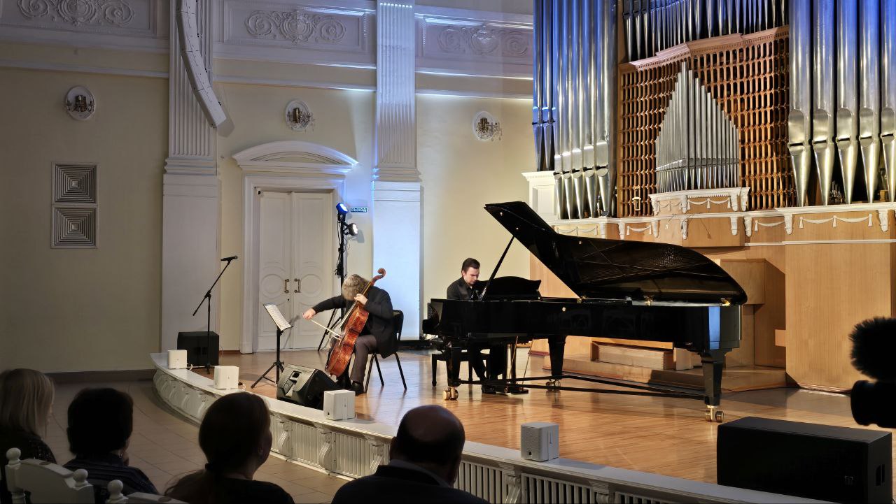 На сцене - народный артист России виолончелист Александр Князев и лауреат международных конкурсов, среди которых престижный конкурс пианистов, композиторов и дирижеров им. С. В. Рахманинова (2022, I премия и Золотая медаль), а также обладатель наград Молодежных Дельфийских игр России пианист Александр Ключко.