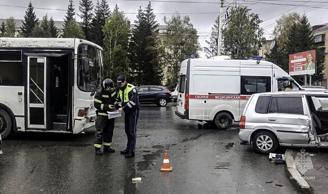 В результате ДТП столкнулись пассажирский автобус и иномарка.