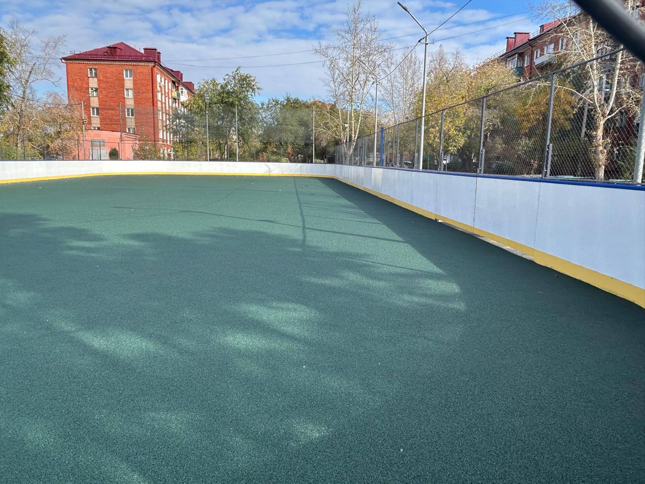 Подрядчик выполнил асфальтовое основание и уложил специальное резиновое покрытие. Уже смонтированы борта и установлена защитная сетка для болельщиков. В ближайшее время на площадке появятся ворота и баскетбольные кольца.