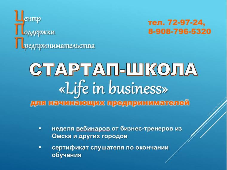 С 20 по 24 октября в онлайн-формате пройдет обучающий проект «Стартап-школа Life in Business», организованный КУ г. Омска «Центр поддержки предпринимательства».