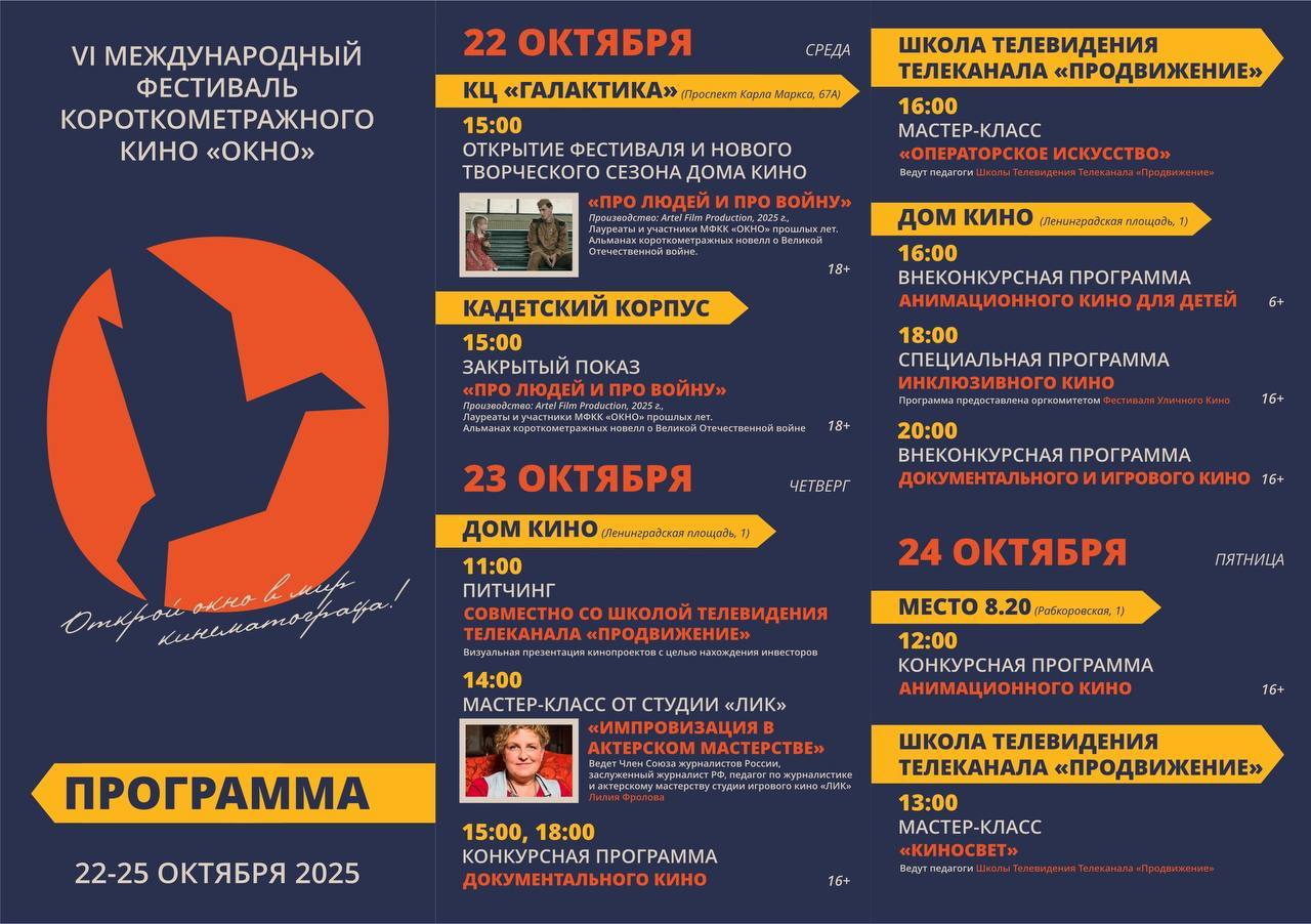22–25 октября наш город вновь станет площадкой для молодых кинематографистов. В этом году участие принимают более 400 режиссёров из разных регионов страны и 12 зарубежных государств.