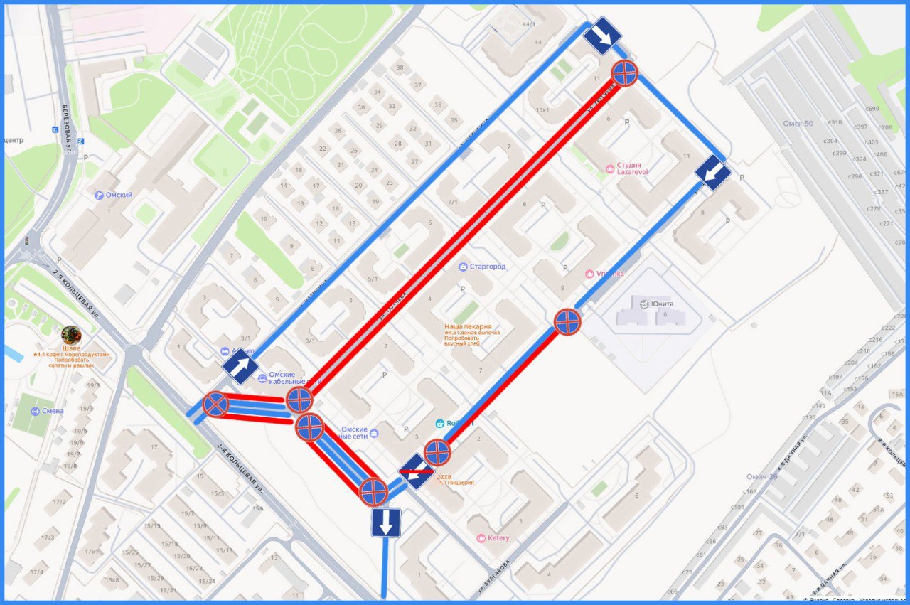 Движение автомобилей по ул. Нагибина от дома № 3/1, проезду до ул. Шукшина, а также по ул. Шукшина станет односторонним до выезда на ул. 2-я Кольцевая.