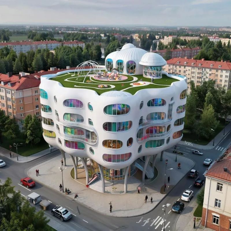 Это здание современного детского сада в Омске на 300 мест, каким его представляет ИИ.
