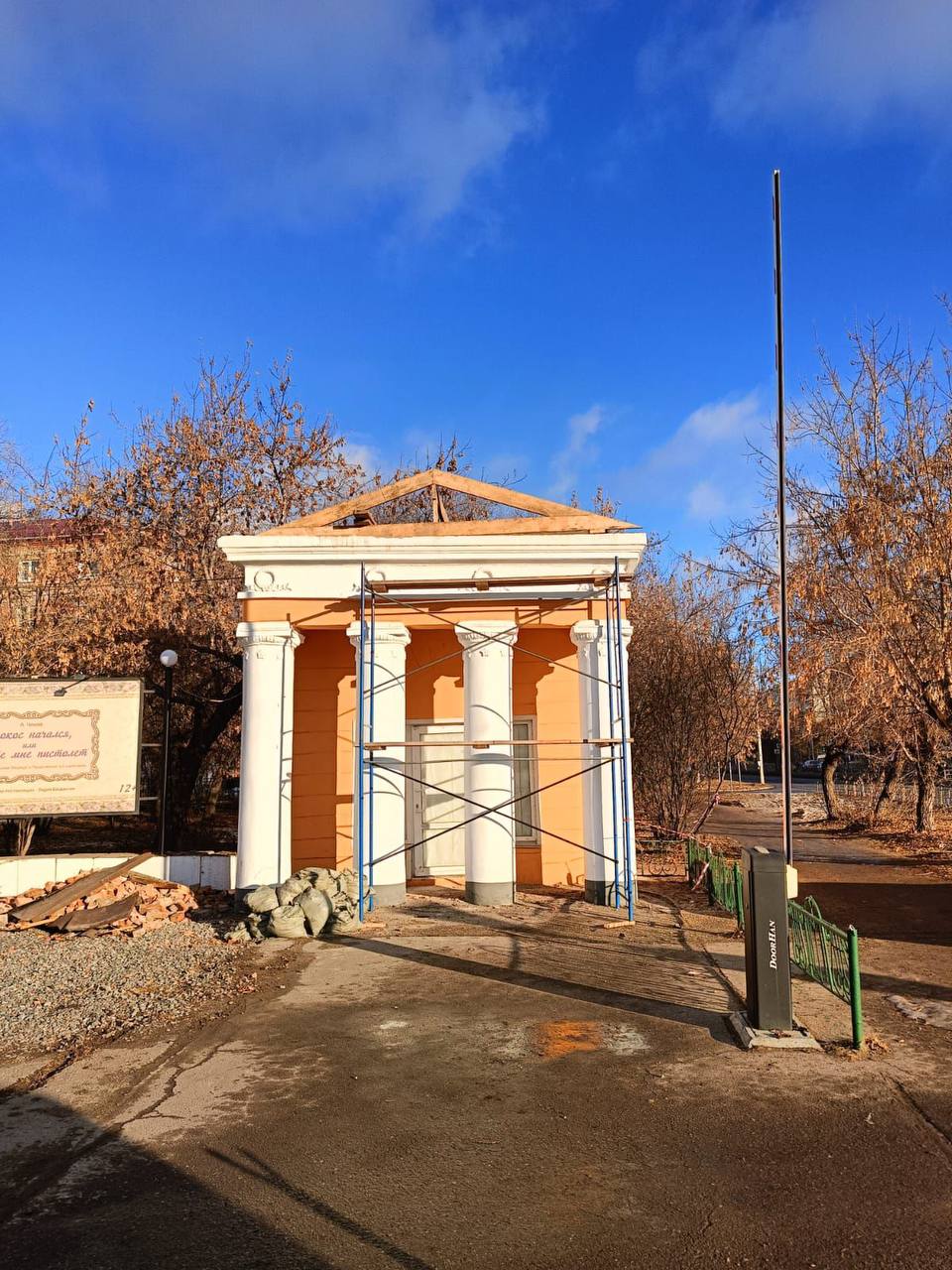 В кассах городского драматического театра им. Л. Ермолаевой заканчивается ремонт. Летом рабочие обновили фасады, сейчас занимаются кровлей и отделкой внутренних помещений. После ремонта одна касса будет перепрофилирована под цветочную лавку, вторая продолжит работу по прямому назначению.
