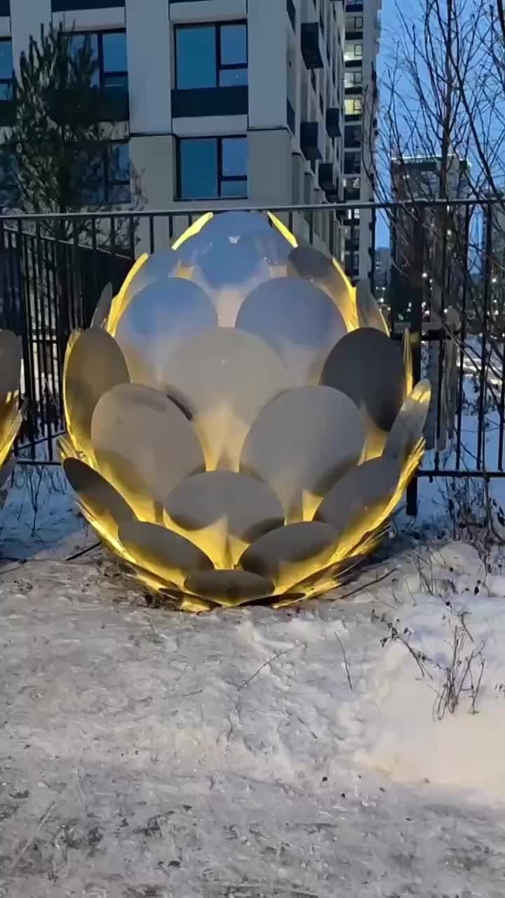 В Кировском округе установили необычные металлические шишки – каждая весит почти 700 кг. Инсталляции из нержавеющей стали появились на территории «Кварталов Драверта» и уже привлекают внимание прохожих.