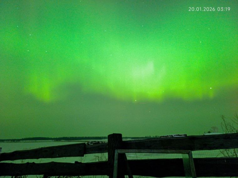«Уже собиралась спать, как увидела уведомление о прибытии выброса с Солнца. За сутки дошёл — это очень быстро. Третий раз вижу сияние над головой, и в этот раз оно мерцало, уходило далеко на юг», — рассказала фотограф Милена Пономарева.
