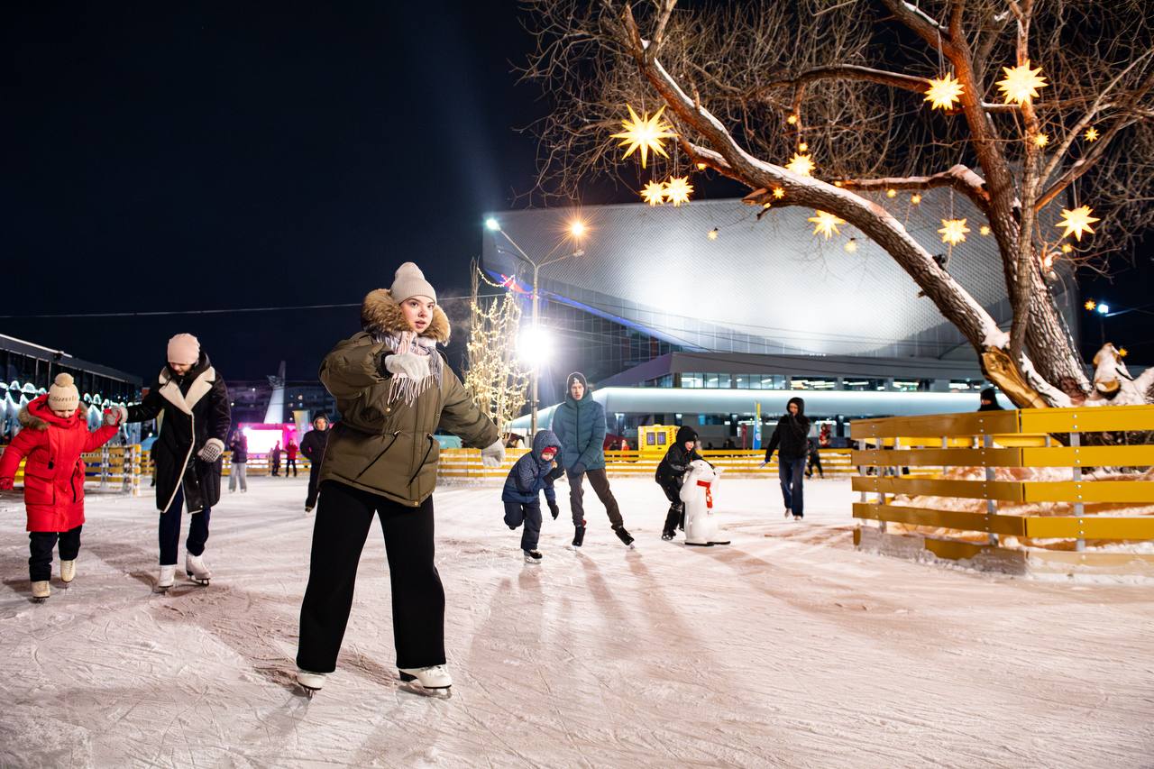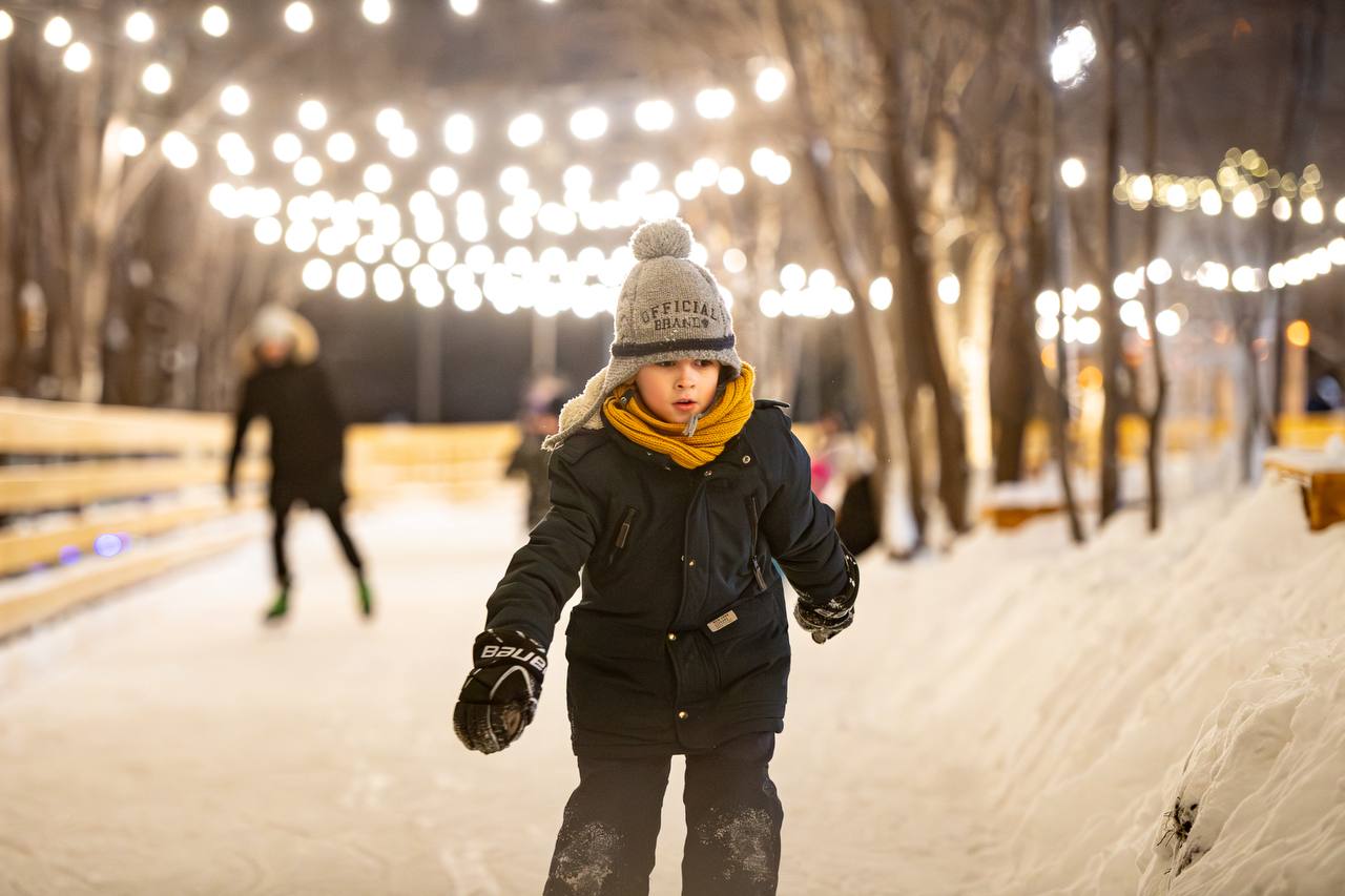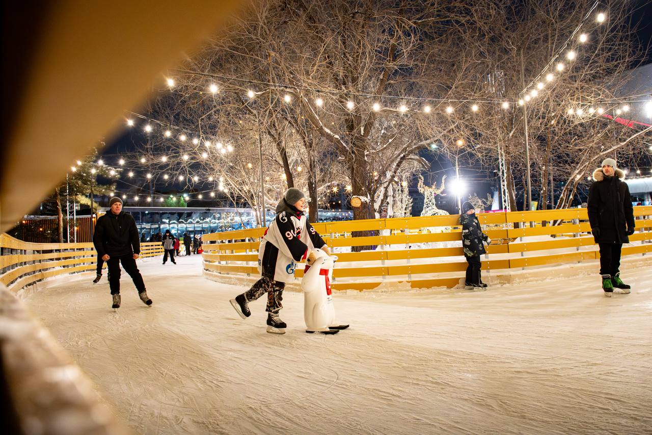 Вечером всё озаряется тысячами огоньков, мерцающими гирляндами и праздничной музыкой, а каток превращается в настоящую зимнюю сказку!