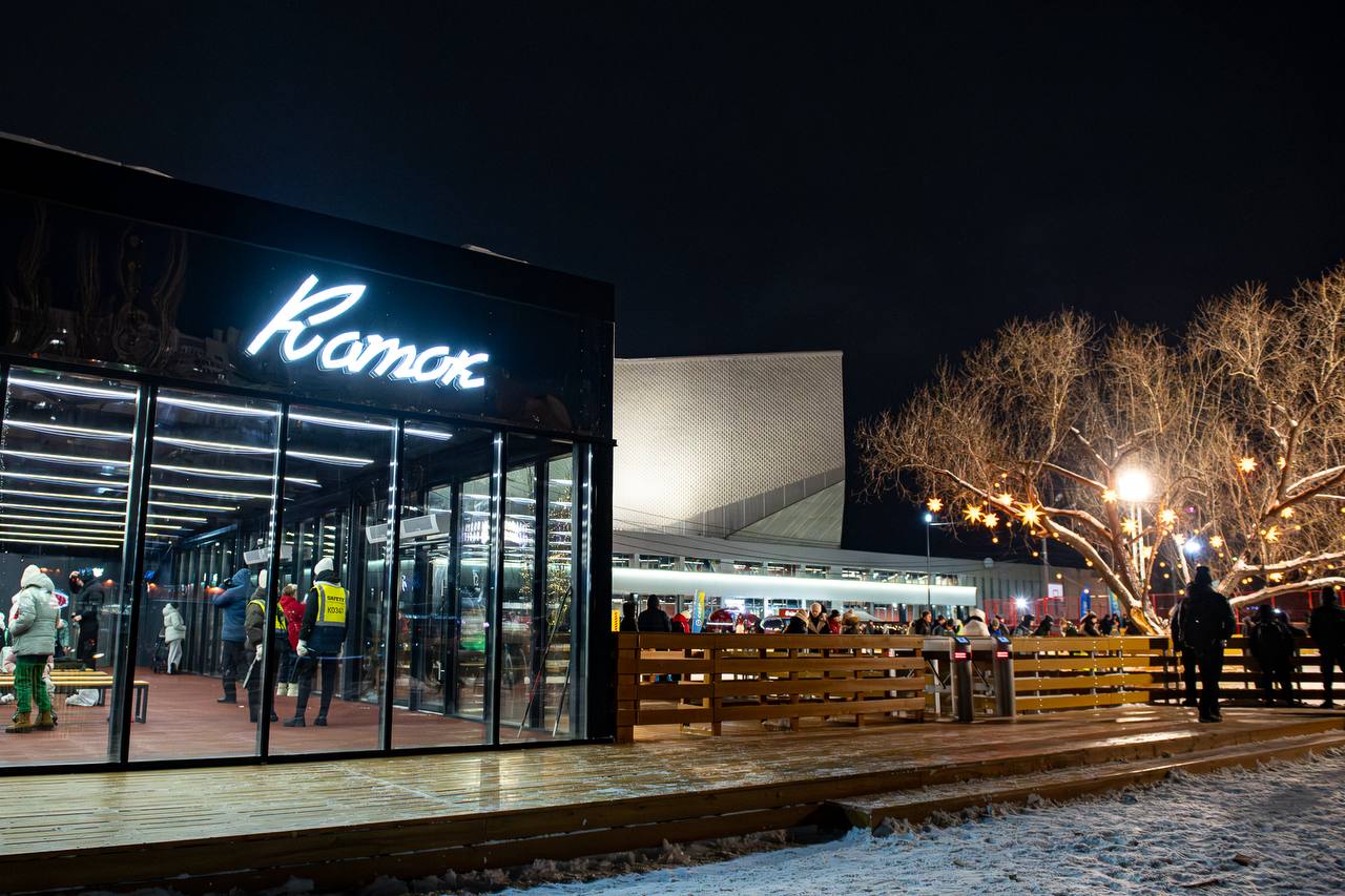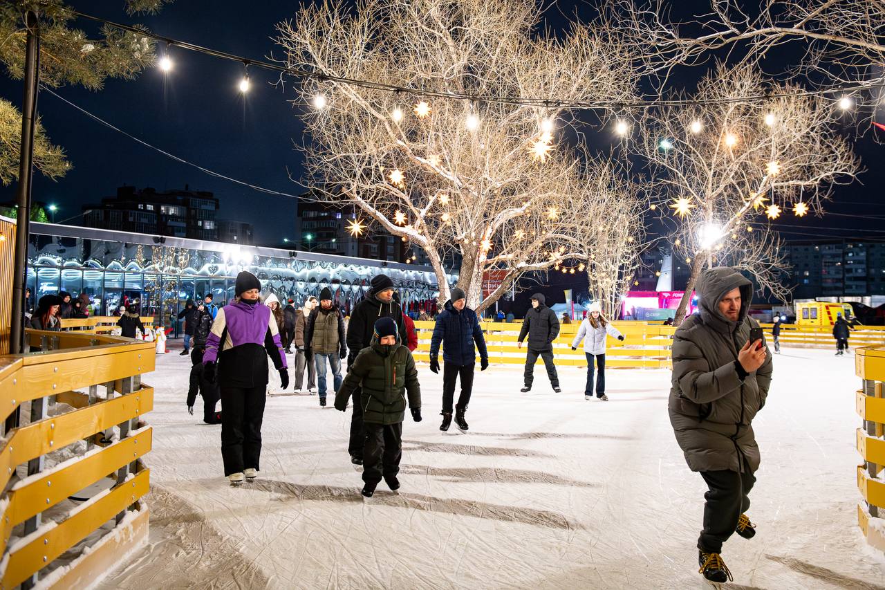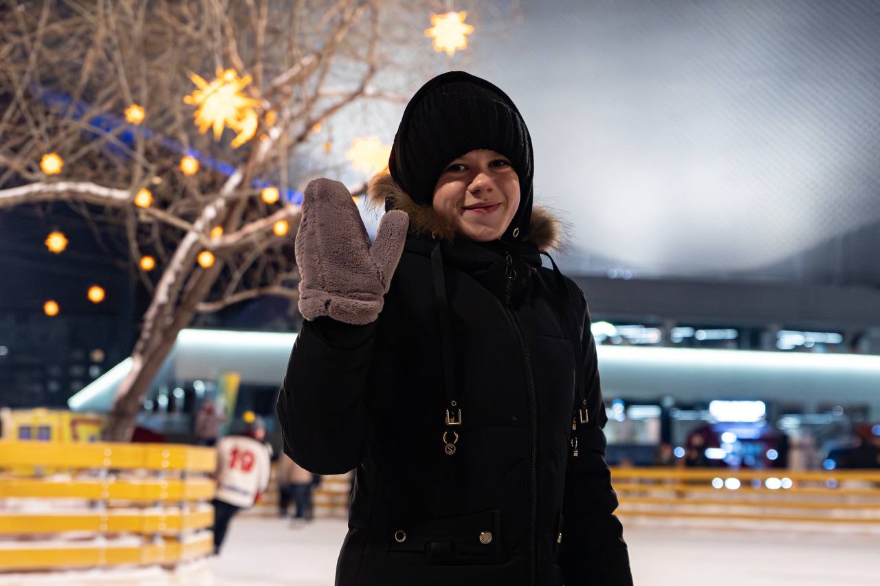 Вечером всё озаряется тысячами огоньков, мерцающими гирляндами и праздничной музыкой, а каток превращается в настоящую зимнюю сказку!