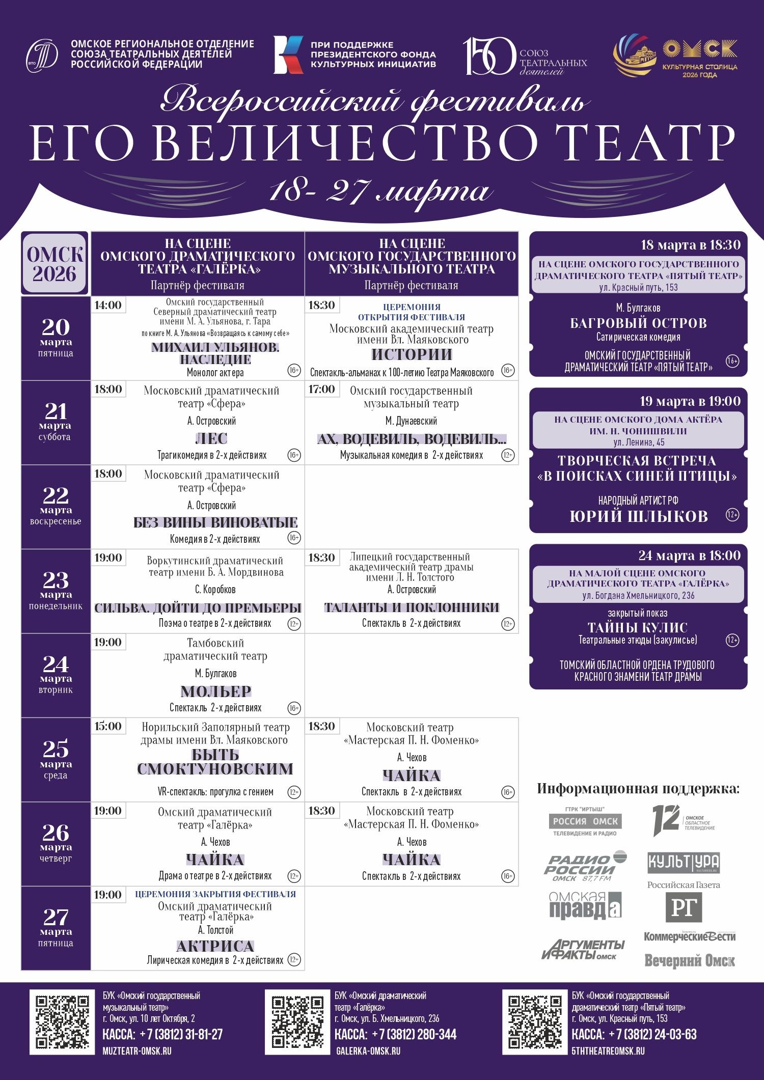 С 18 по 27 марта в Омске впервые пройдёт всероссийский фестиваль «Его величество Театр», посвященный 150-летию Союза театральных деятелей России. Организаторы получили грант Президентского фонда культурных инициатив.