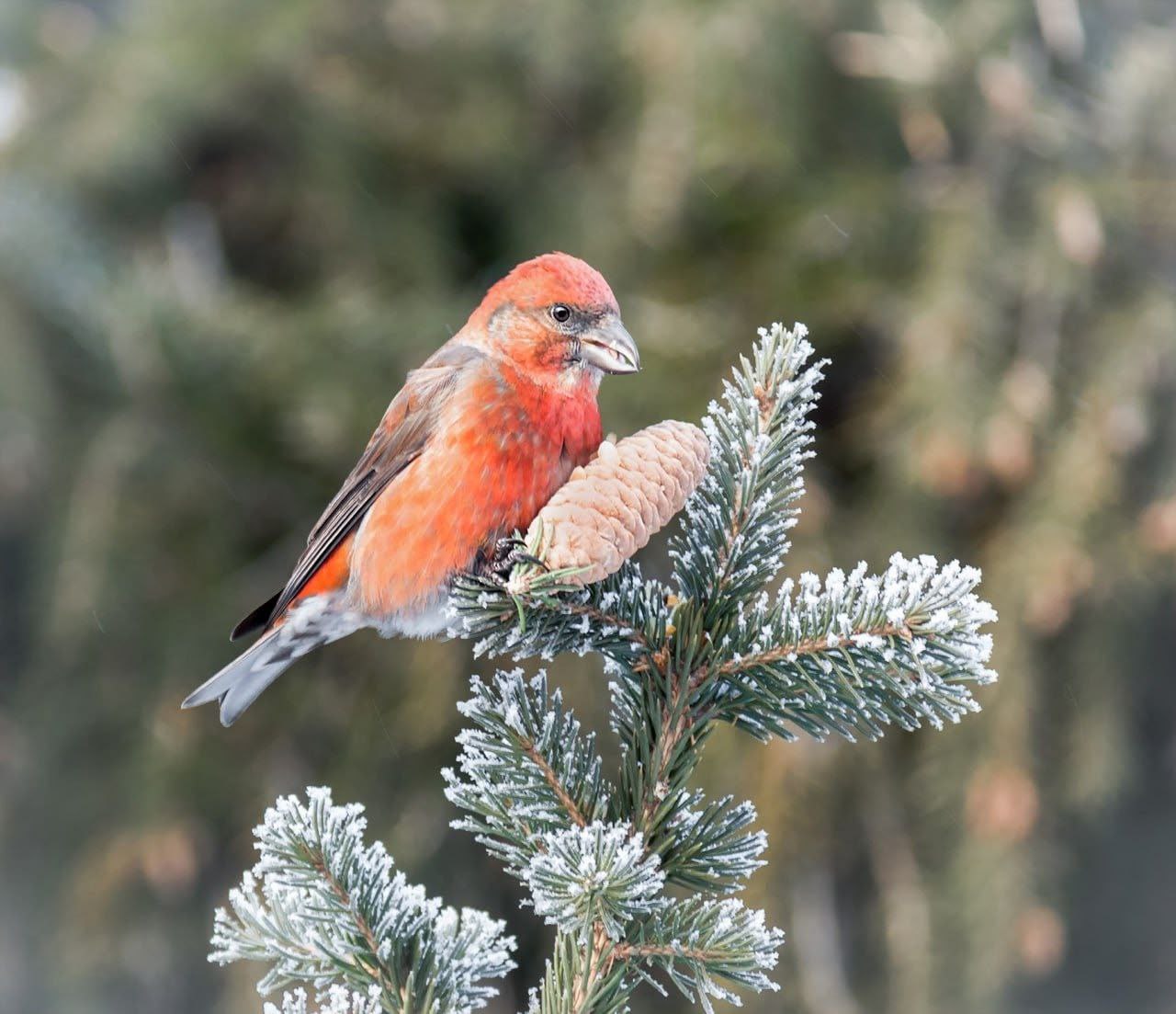 Клёст-еловик — главный зимний специалист с уникальным крестообразным клювом для добычи семян из шишек. Может выводить птенцов даже в лютые морозы!