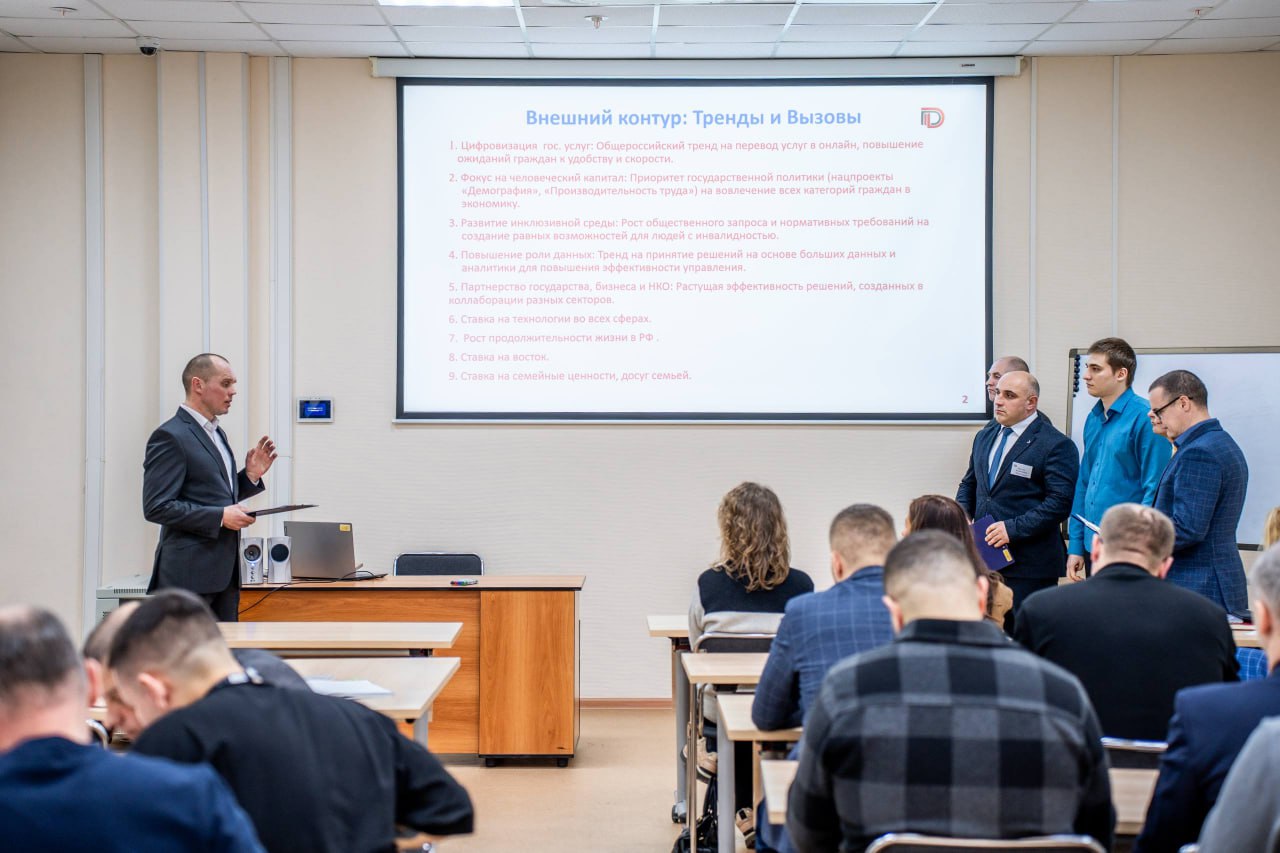 Аттестация стала логическим завершением интенсивного аналитического этапа, в ходе которого слушатели, разделённые на четыре команды — «Экономика», «Социальная сфера», «Инфраструктура и безопасность» и «Управление» — проводили стратегический анализ своих направлений. Работа велась по классической методике: оценка внешних трендов, возможностей и угроз, а также сильных и слабых сторон региона.