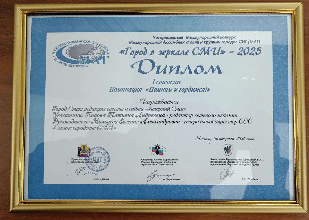 Редактор сетевого издания «Вечерний Омск» Татьяна Попова заняла I место в номинации «Помним и гордимся!», посвященной 80-летию Победы в Великой Отечественной войне. Жюри высоко оценило серию её публикаций. В частности, среди них была статья о поездке в Волгоград по местам боевой славы знаменитой 308-й стрелковой дивизии Л.Н. Гуртьева.