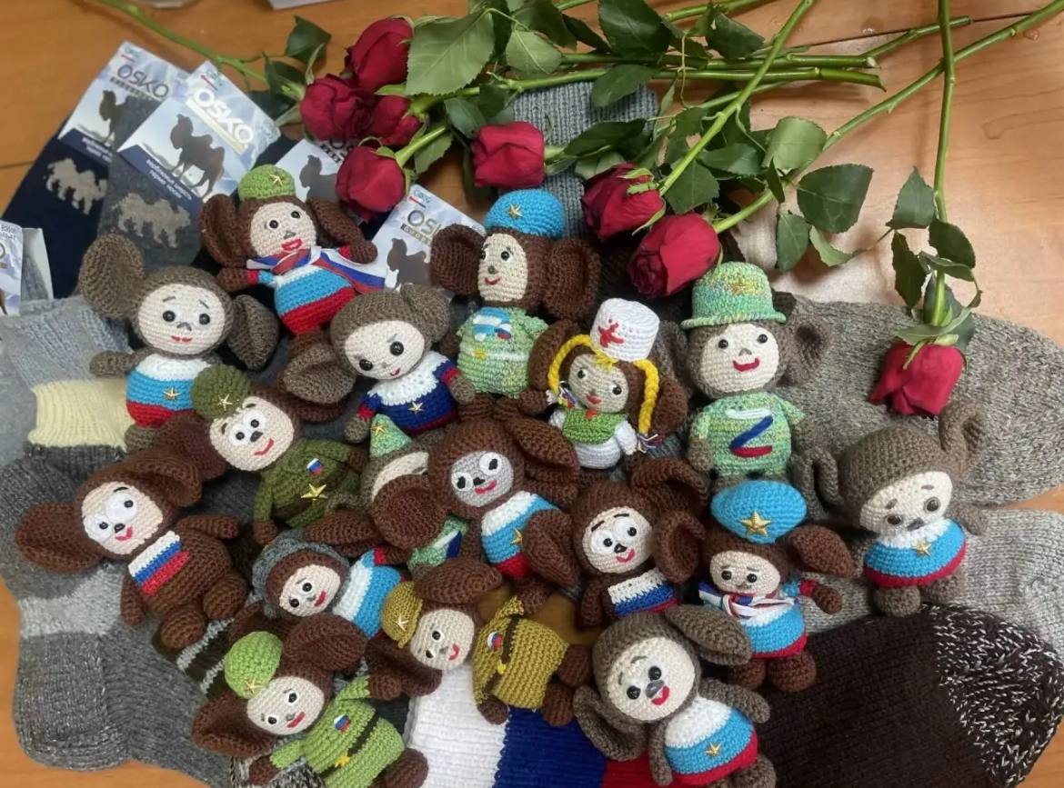 Активный член КТОСа «Парковый» Ирина Яковлева отправляет бойцам вязаные шерстяные носки и мягкие игрушки — чебурашки. Ирина уже создала и передала более сотни чебурашек.