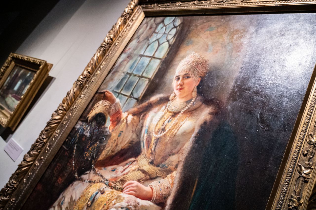 Одно из центральных мест занимает полотно из омской коллекции. К 185-летию со дня рождения Константина Егоровича Маковского (1839–1915) в постоянную экспозицию музея после длительной реставрации вернулось эффектное полотно «Боярыня у окна», которое стало настоящей жемчужиной экспозиции.