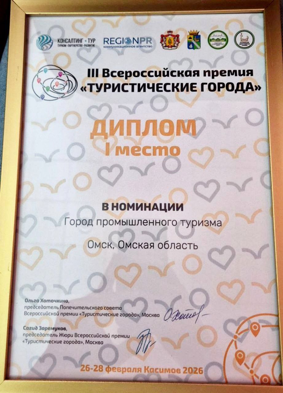 Омск занял первое место в номинации «Город промышленного туризма» на III Всероссийской премии «Туристические города», финал которой прошёл на минувшей неделе в городе Касимов Рязанской области.