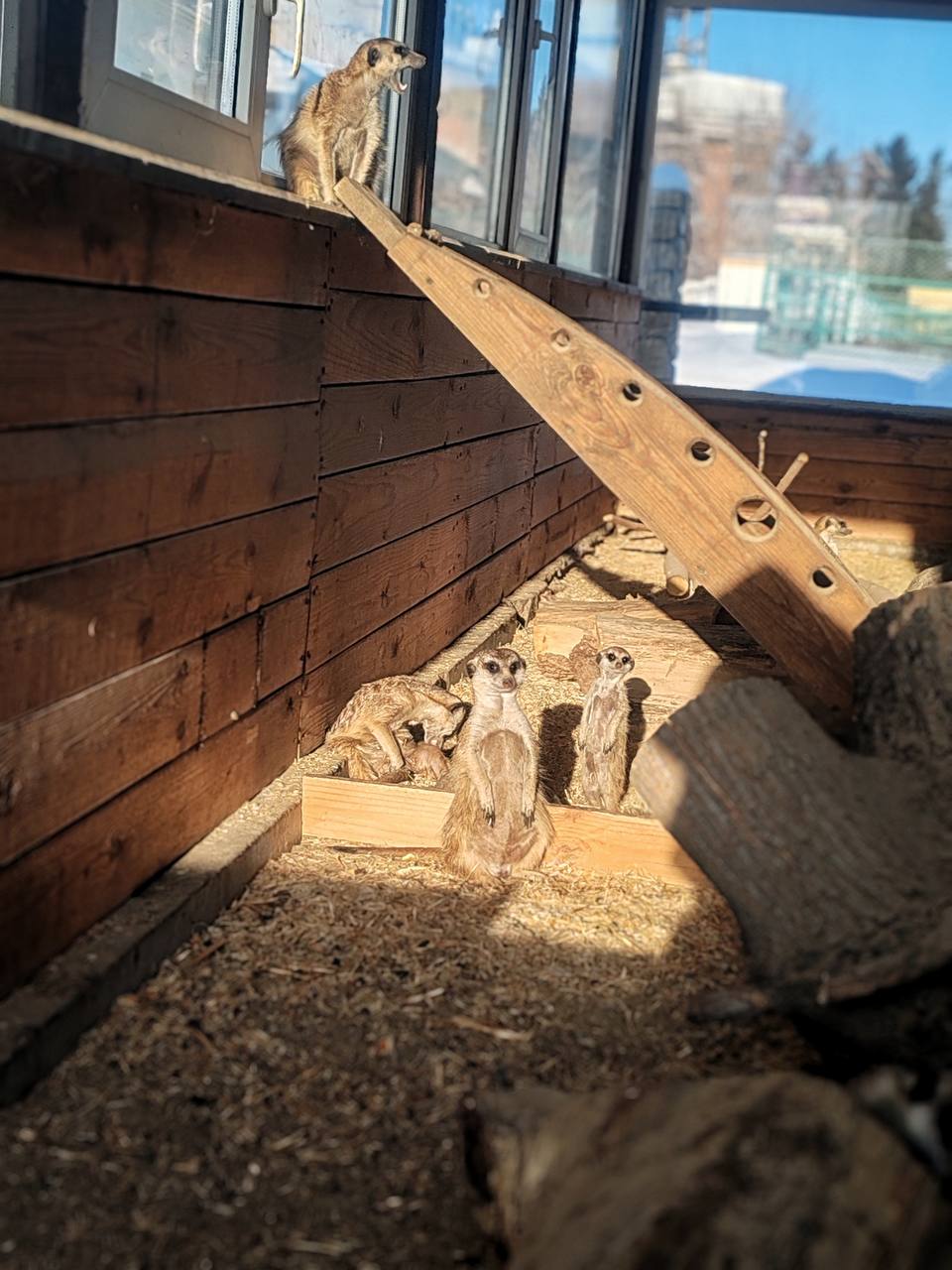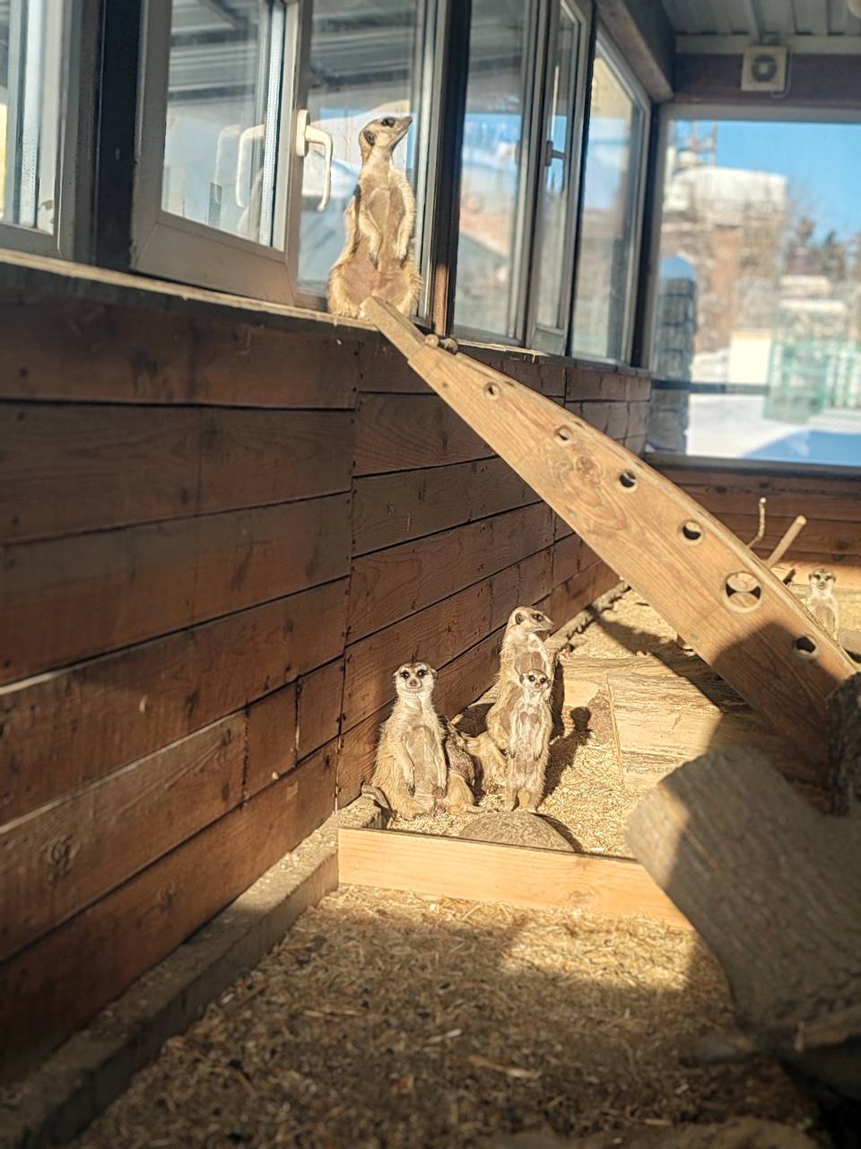 Сурикаты в Большереченском зоопарке принимают солнечные ванны