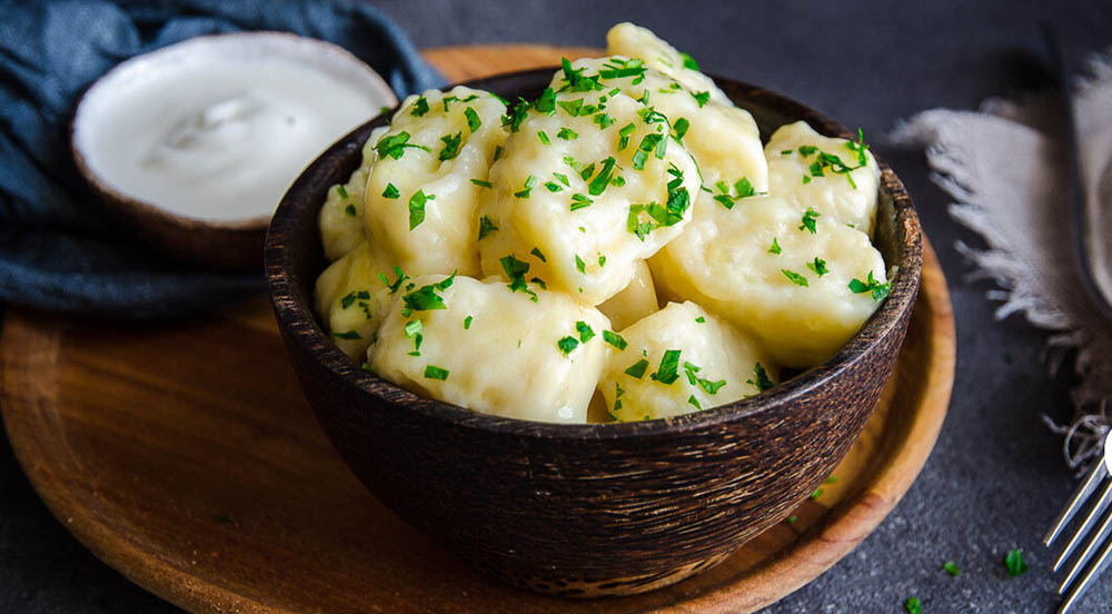 Достаете отдохнувшее тесто, делите его на две части и раскатываете в прямоугольный пласт. Из остывшей картофельной начинки формируете колбаску, укладываете вдоль края пласта и аккуратно заворачиваете рулет. Затем нарезаете его на кусочки, которые по форме напоминают пухлые подушечки. Каждый кусочек слегка прижимается, чтобы избежать потери начинки во время варки.