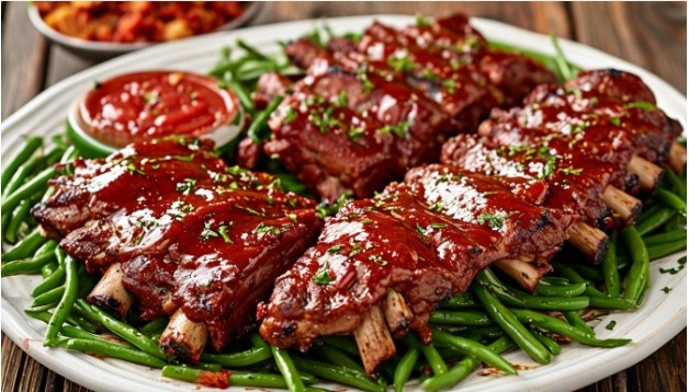 Как только ребрышки приобрели аппетитную корочку, достаньте их, посыпьте оставшимся соком и снова обмажьте соусом. Вместе с ребрами можно подать и зеленую фасоль, предварительно смешанную с оставшимся соусом и горчицей. Выложите на большую тарелку, добавив вокруг фасоль, чтобы создать красивую сервировку. Подавать горячими и наслаждаться моментом!