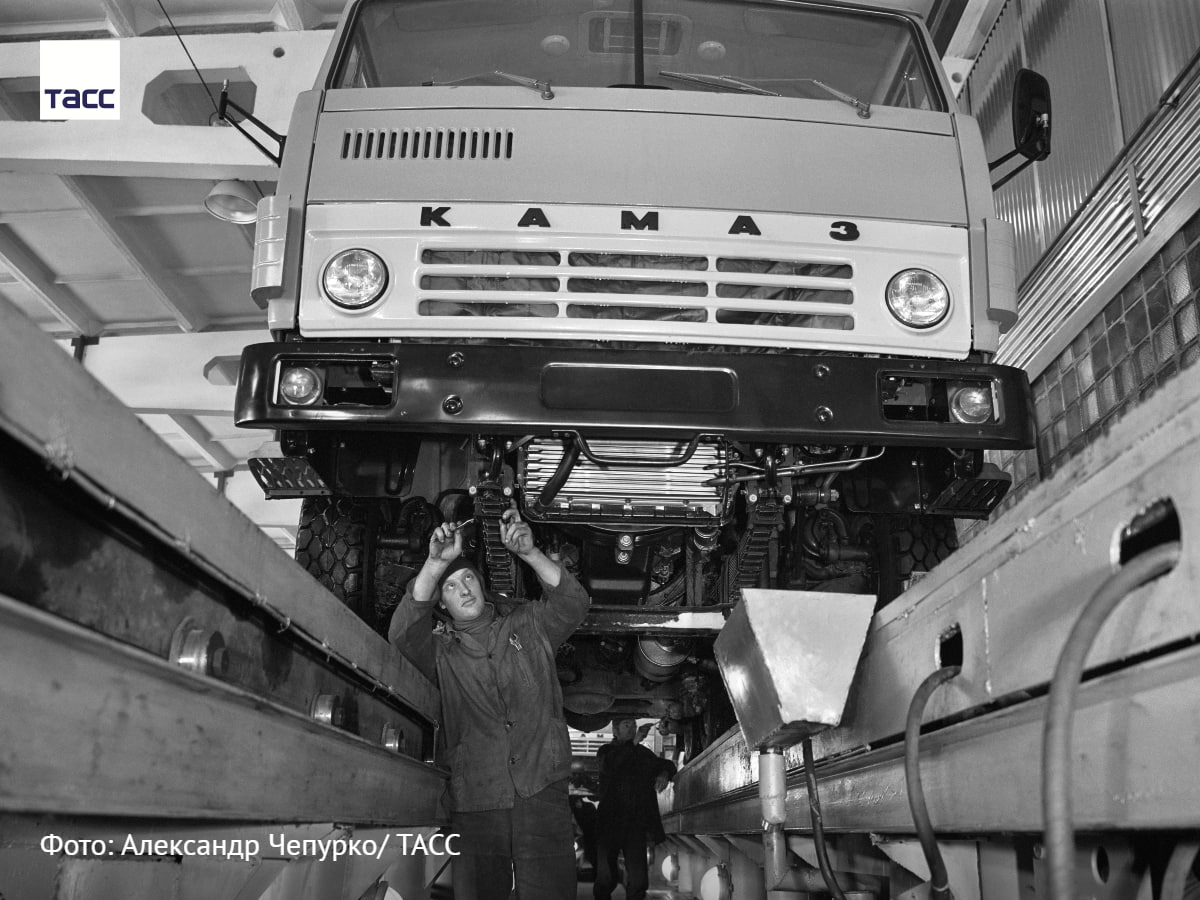 Техобслуживание автомобилей на пульсирующем конвейере в мастерской Омского транспортного предприятия.