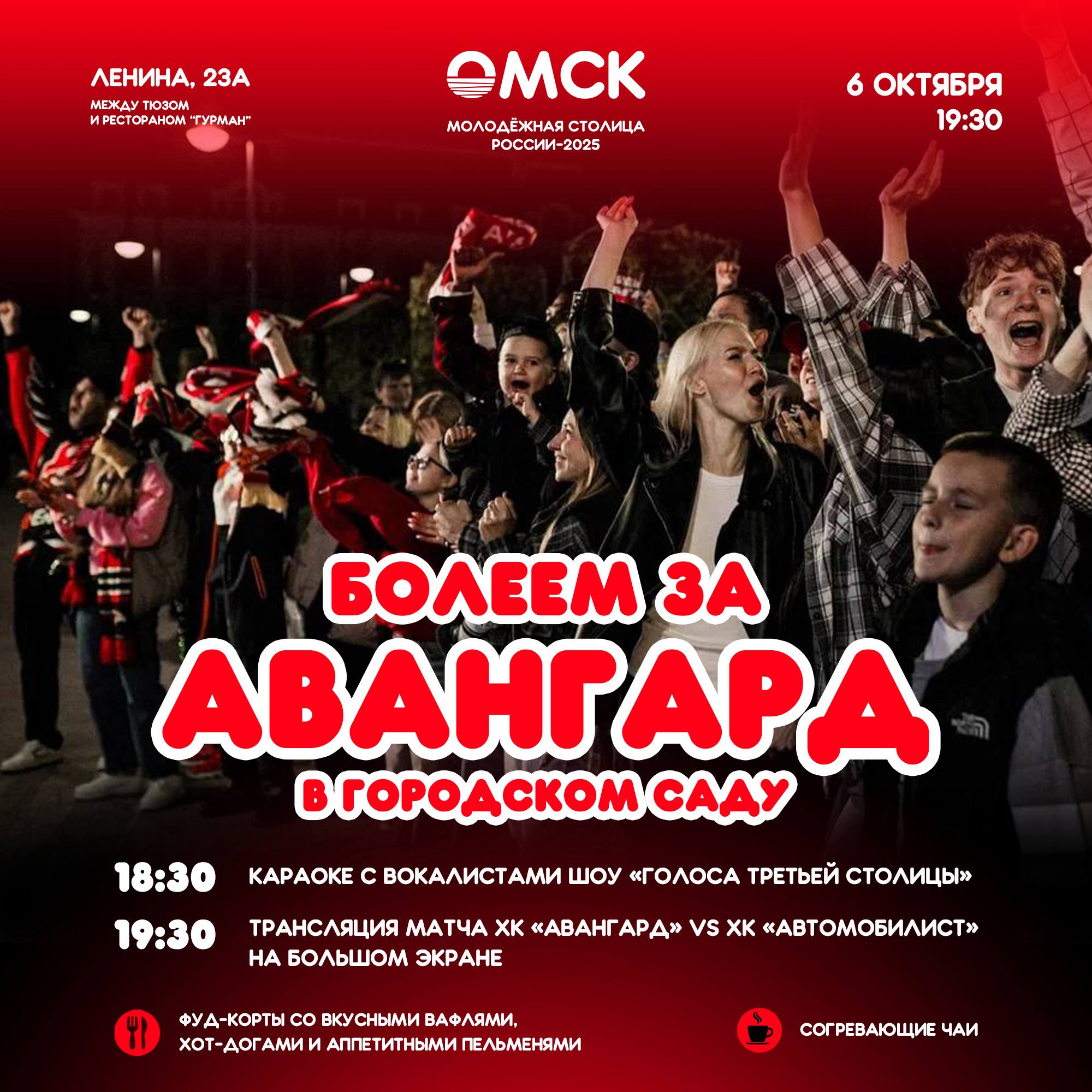 В 18:30 для вас будет работать караоке под открытым небом, а уже в 19:30 начнется матч и мы начнем болеть за «ОМСКИЙ АВАНГАРД»