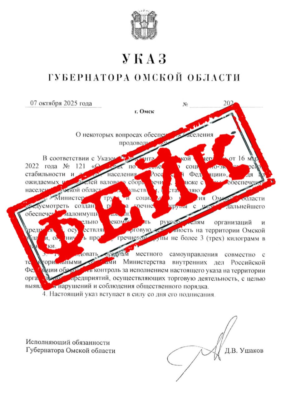 «Этот документ — фейк. Подобного указа в Омской области не принимали», — сообщила пресс-секретарь губернатора Омской области Мина Ахвердиева.