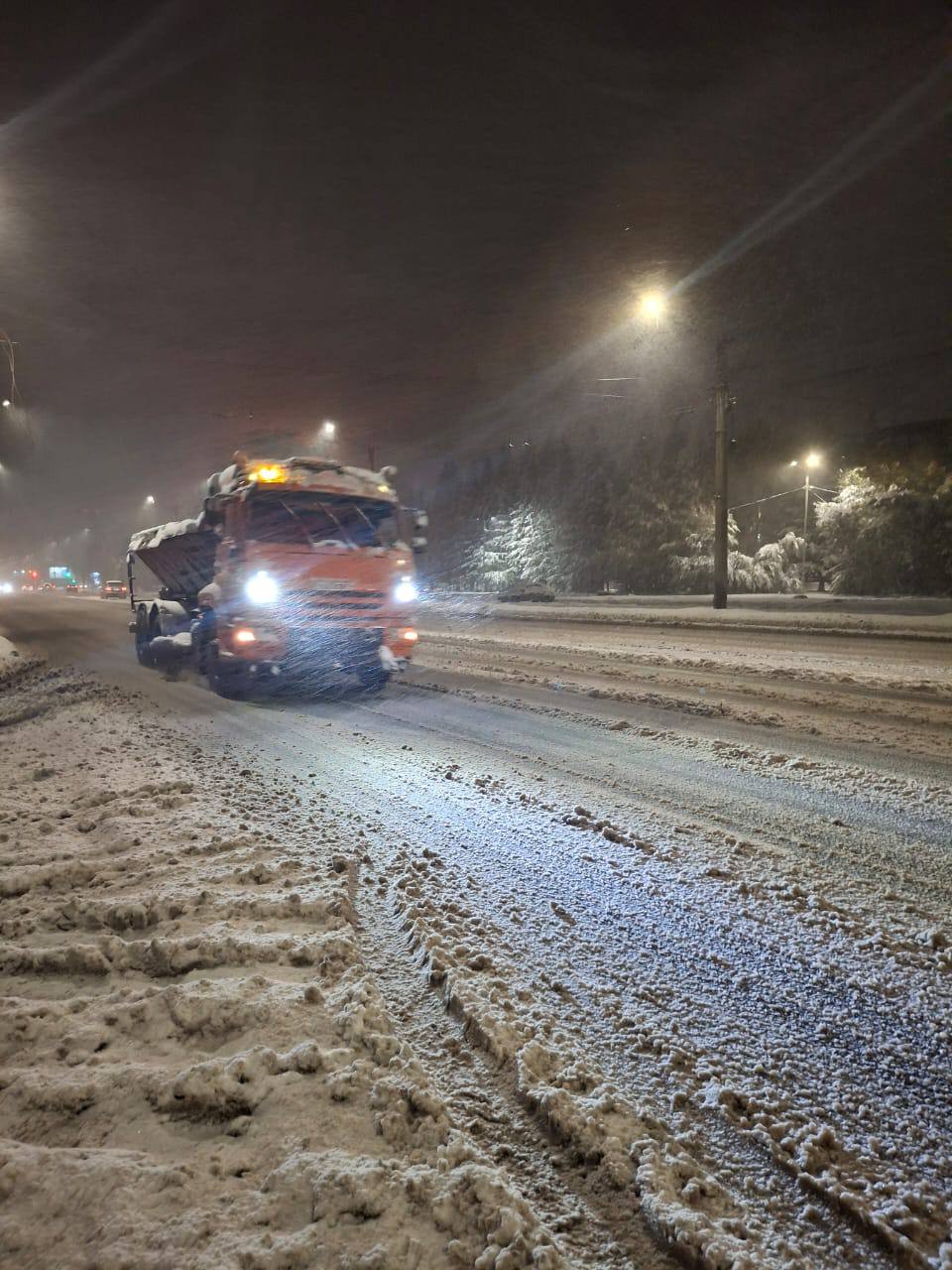 Во всех округах города дежурные бригады Управления дорожного хозяйства и благоустройства работают в ночную смену. Обрабатываем противогололедными материалами проезжую часть дорог, особое внимание — мостам и путепроводам.