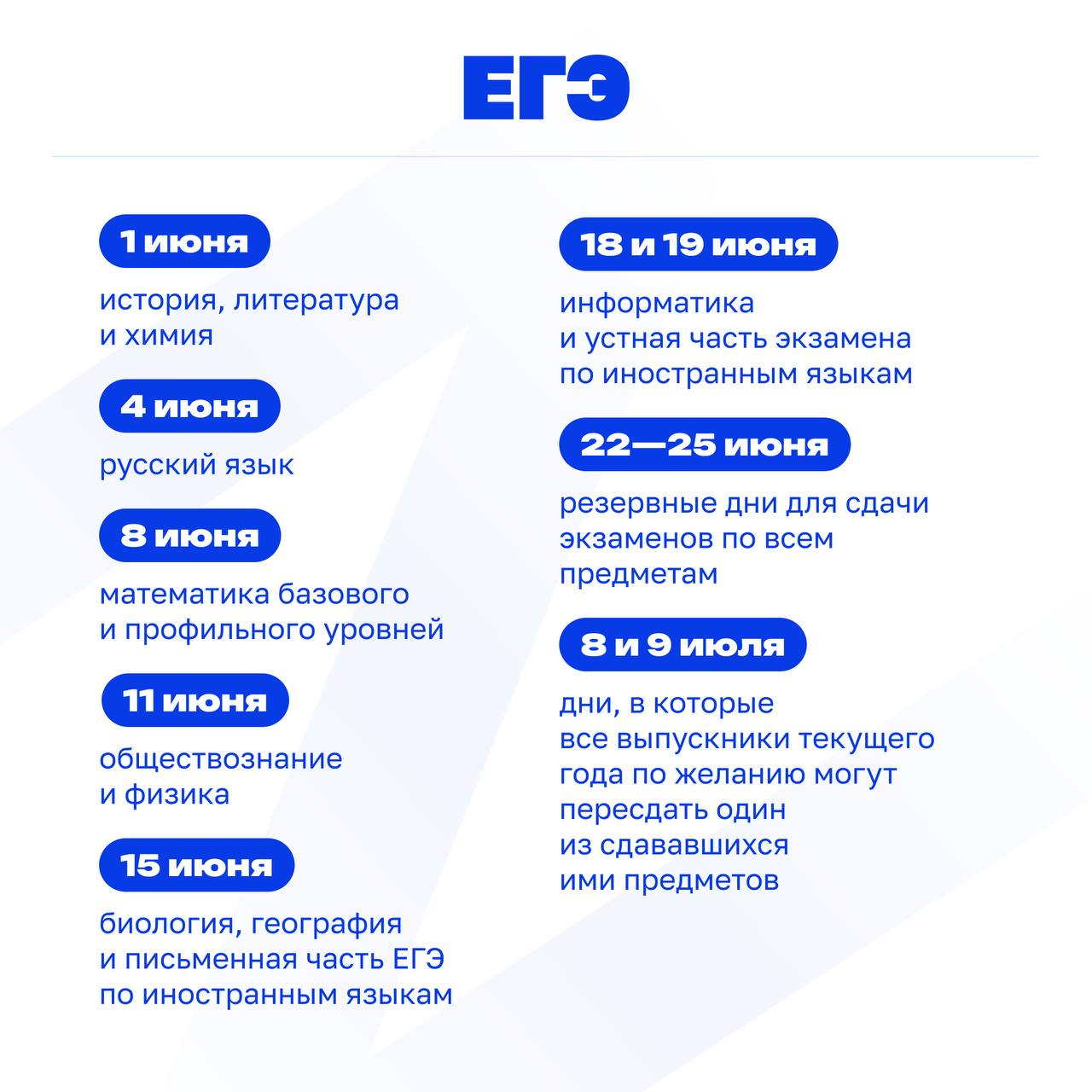 29 июня- резервный день для сдачи экзамена по математике, 2 июля – по русскому языку, 3 и 6 июля – по всем учебным предметам, кроме русского языка и математики.