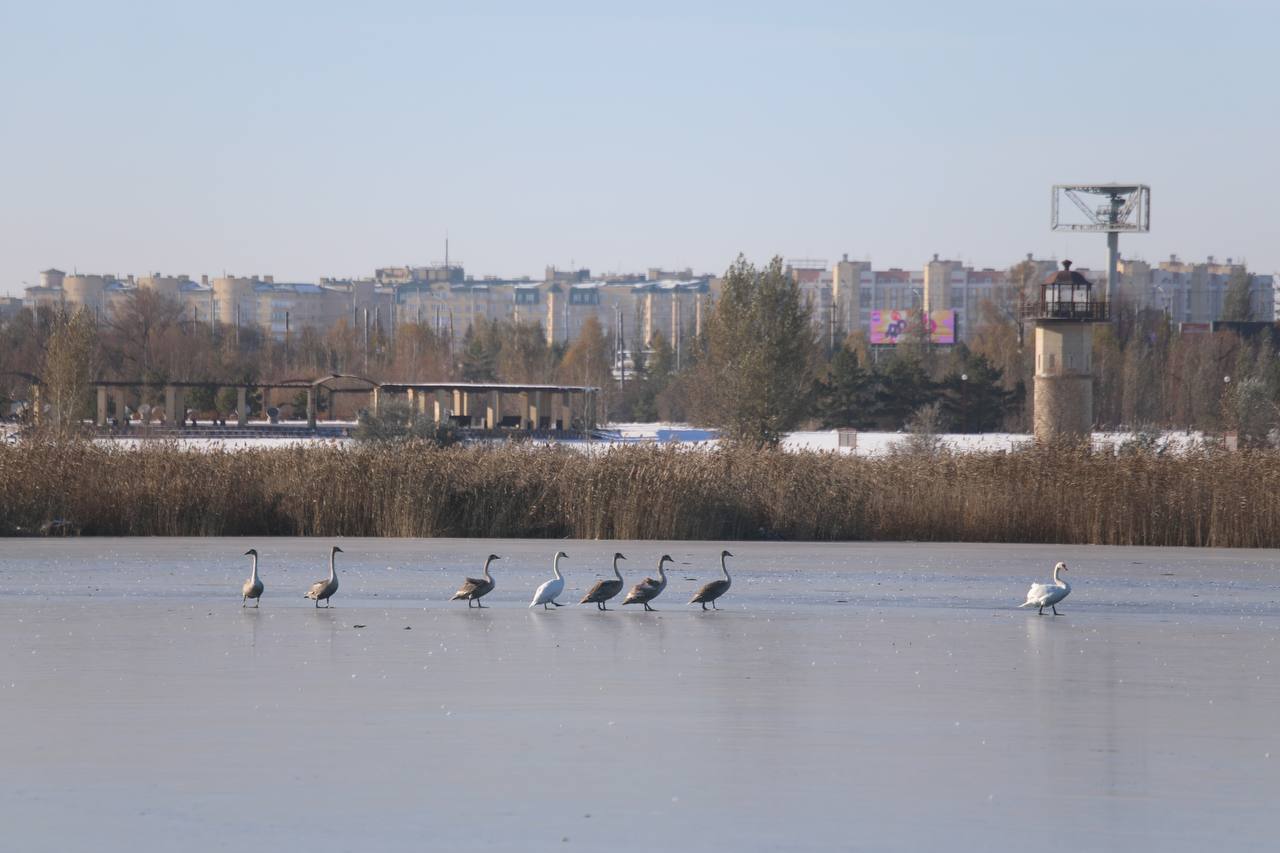 Природный парк «Птичья гавань» стал временным домом для лебедей-шипунов. Несмотря на то, что пруд начал покрываться льдом, птицы продолжают спокойно готовиться к дальнему перелёту.