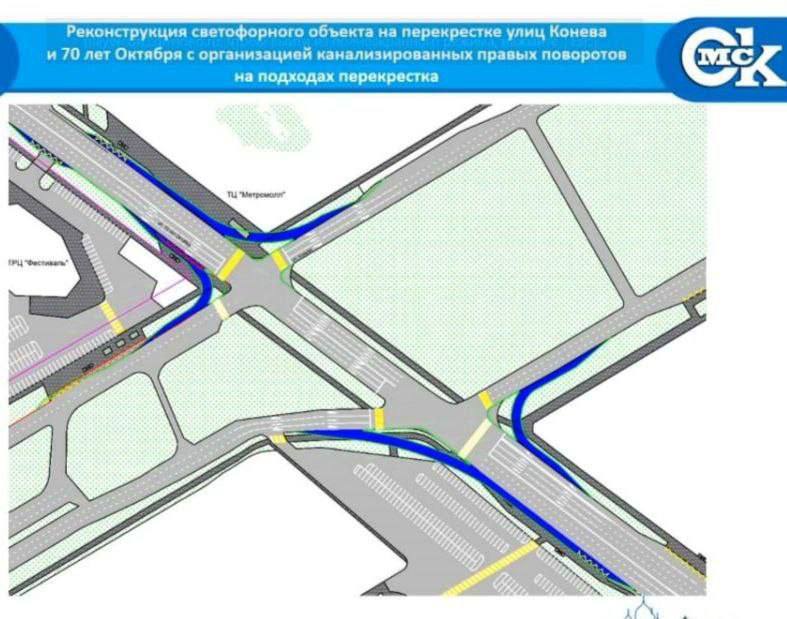 • Вторая – на пересечении улиц Конева и 70 лет Октября. Здесь сделают четыре съезда для правых поворотов.