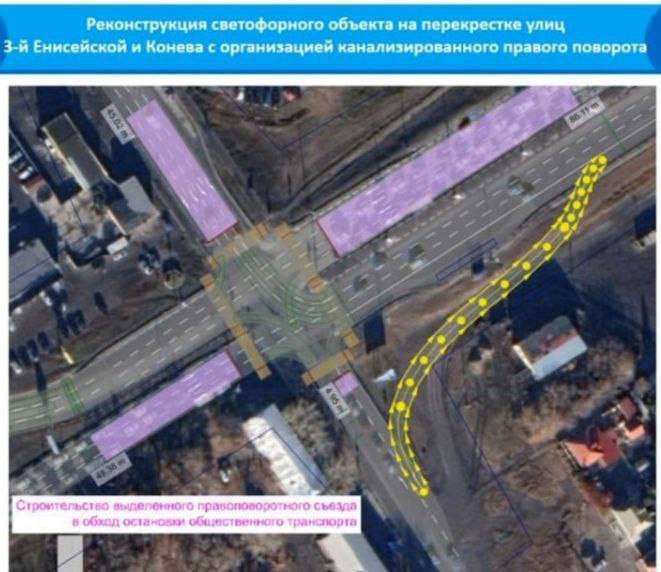 • Первая – на пересечении улиц 3-й Енисейской и Конева. Она поможет машинам поворачивать направо к метромосту.