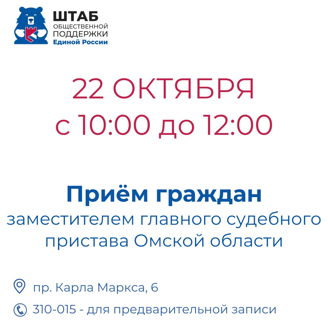 22 октября с 10:00 до 12:00 в Штабе общественной поддержки «Единой России» Симановский Сергей Юрьевич, заместитель главного судебного пристава Омской области, проведет личный прием граждан.