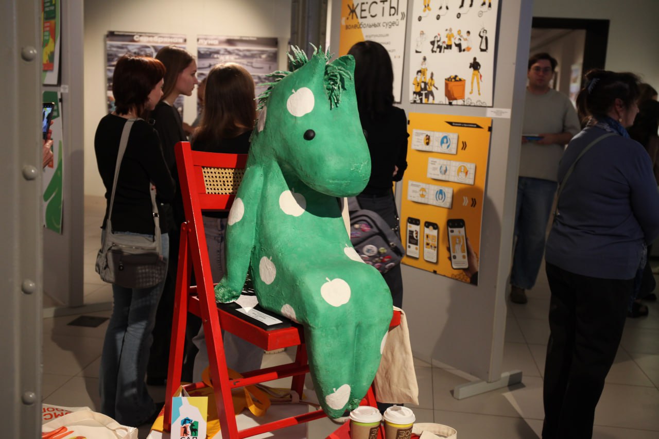 На юбилейной выставке кафедры дизайна ОмГТУ посетителей встречает зеленый конь в яблоках