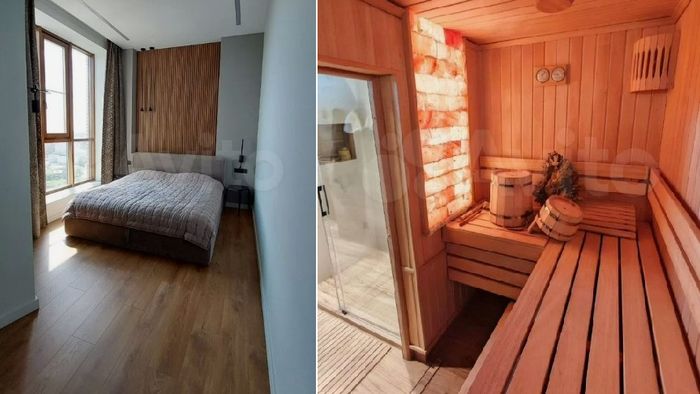 Судя по фотографиям, кроме трех комнат, в квартире также есть сауна и гардеробная. В доме работает консьерж, а территория огорожена. Также в здании есть подземная парковка.
