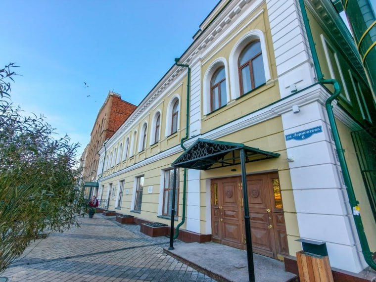 Двухэтажное здание имеет богатую историю: коммерческий клуб, госпиталь, суд, кинотеатр и библиотека – чего оно только не видело. По легенде, именно через парадный вход в 1918 году проходил адмирал Колчак.