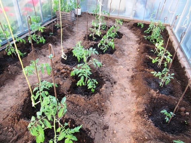 Первым делом следует определить необходимое количество посадочных лунок. Расстояние между ними должно составлять не менее 50-60 см. Это поможет избежать удаления лишних растений и обеспечит им достаточно пространства для роста. В теплице размером 3х6 метров удобно помещаются до 30 кустов томатов, а также оставьте место для огурцов.