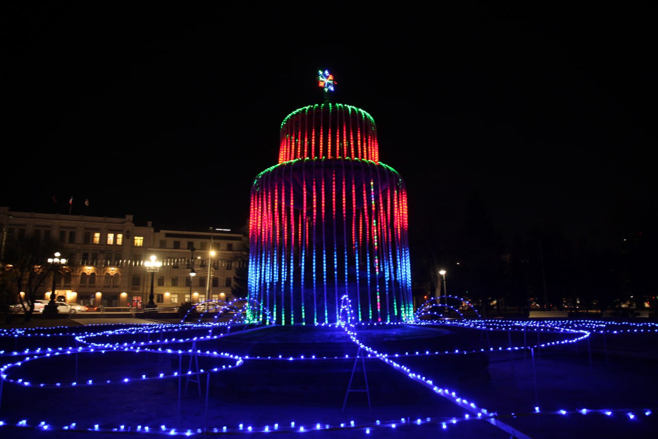 В Омске включили новогоднюю подсветку фонтана в сквере имени Дзержинского