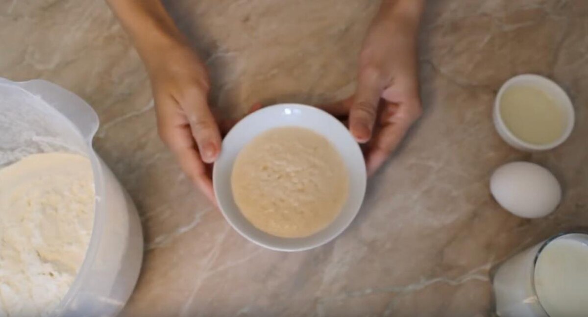 1. Создание опары. В теплое молоко добавить сахар и дрожжи. Перемешать и оставить на 10-15 минут, пока не появятся пузырьки.