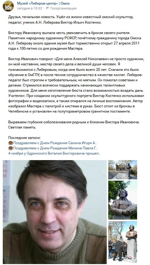 Омский художественный музей «Либеров-центр» поделился в своих соцсетях «печальной новостью» об уходе из жизни известного скульптора Виктора Костенко. В посте говорилось, что Костенко — ученик художника Алексея Либерова, которому посвящён музей, и автор памятника ему. Далее шёл рассказ Костенко об учителе и «выражение глубоких соболезнований родным и близким». Сообщение о смерти вызвало грусть и скорбь среди студентов скульптора и знавших его людей, однако через некоторое время в комментариях появился сам Виктор Костенко. «Слава богу, жив здоров, привет автору статьи, не каждому в этой жизни, дано прочитать о себе слова о безвременном уходе!» — написал скульптор [орфография и пунктуация автора сохранены].