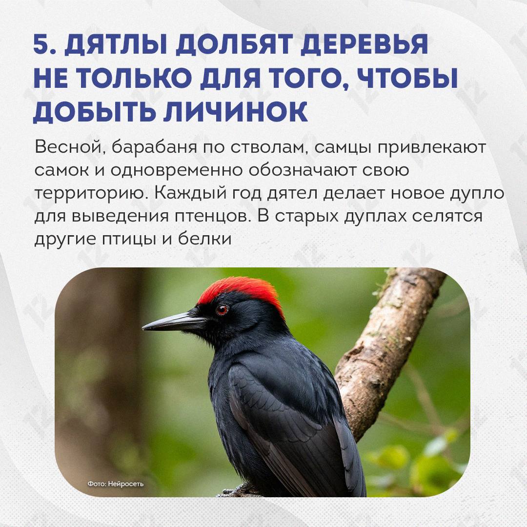 Дятлы никогда не выбирают здоровые деревья — им нужны те, где поселились насекомые. Поэтому чаще всего они долбят больные или трухлявые стволы, очищая лес от вредителей и спасая деревья от гибели.