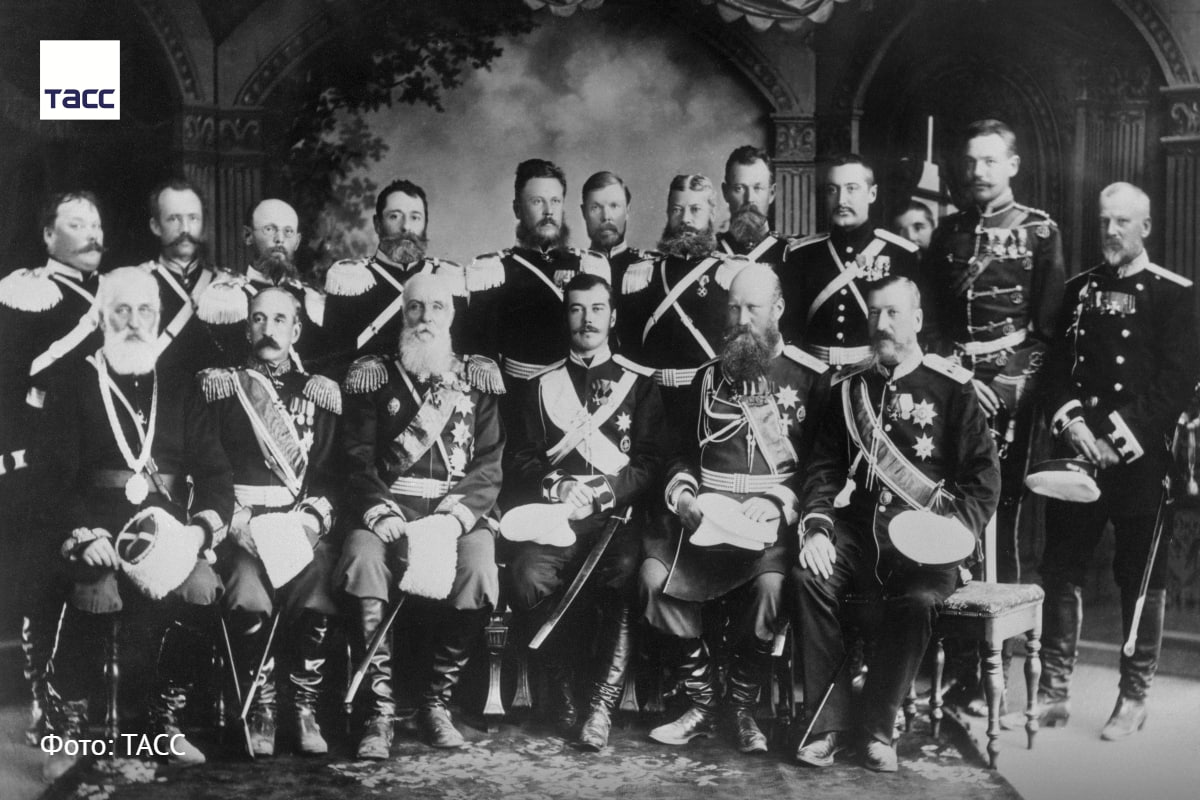 Совершающий восточное путешествие Николай II и начальники отделов Семиреченского казачьего войска в здании Войскового Хозяйственного правления.
