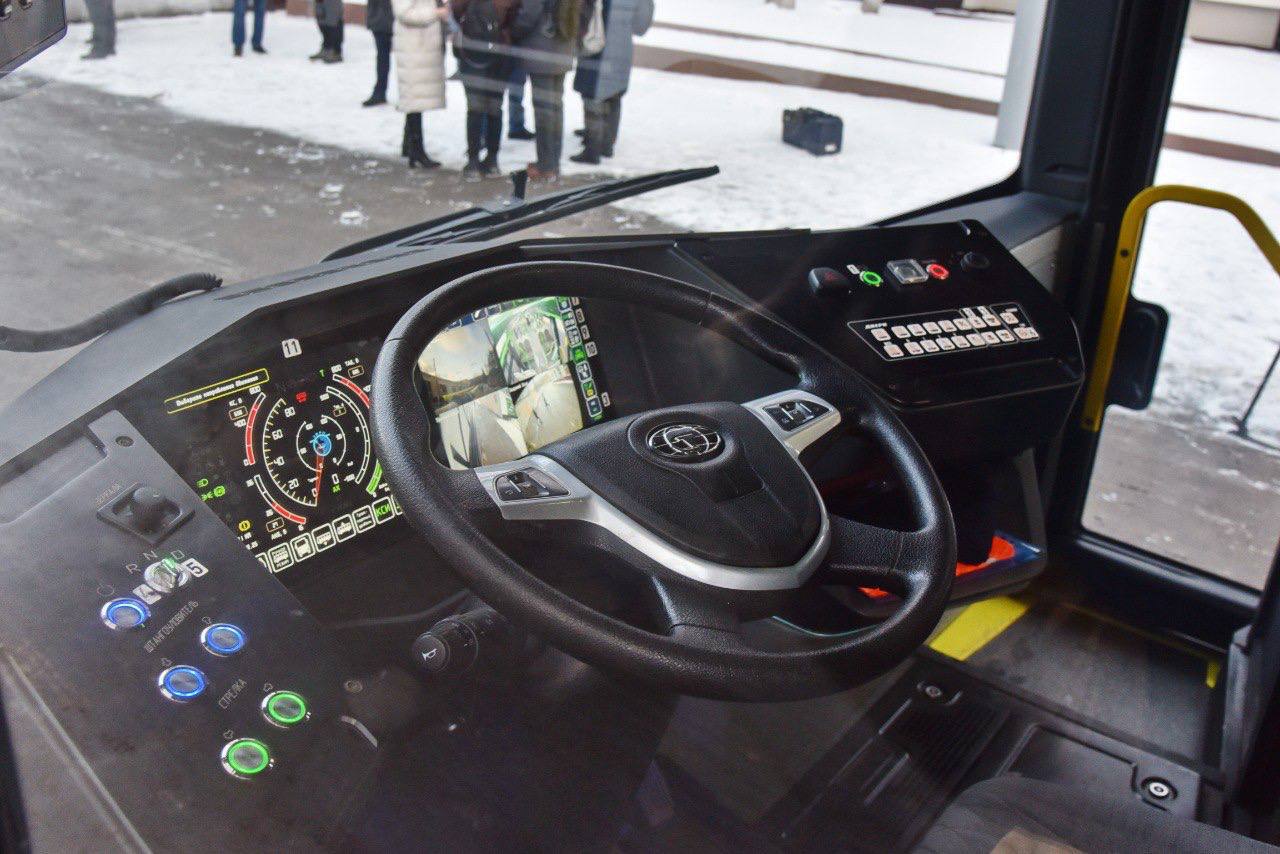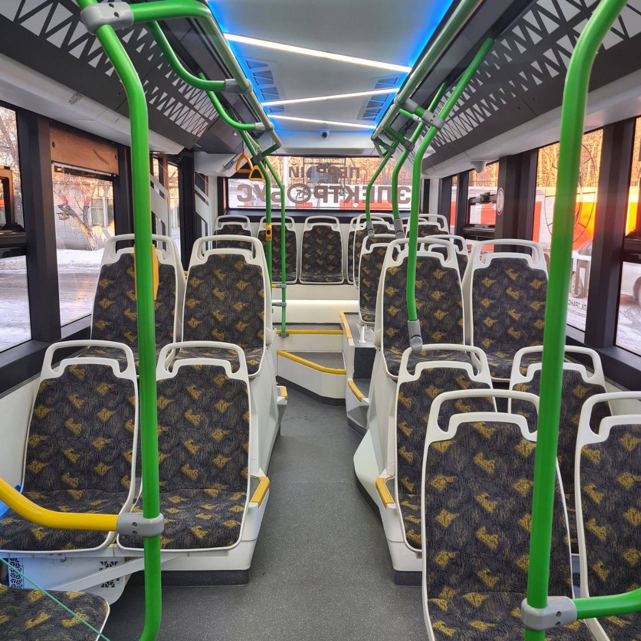 Внутри – климат-контроль, мультимедиа, удобная зона для маломобильных пассажиров, широкие двери и просторная площадка. Водителю тоже комфортно: современное кресло, «умный» руль и камеры. Вместимость – до 80 человек.