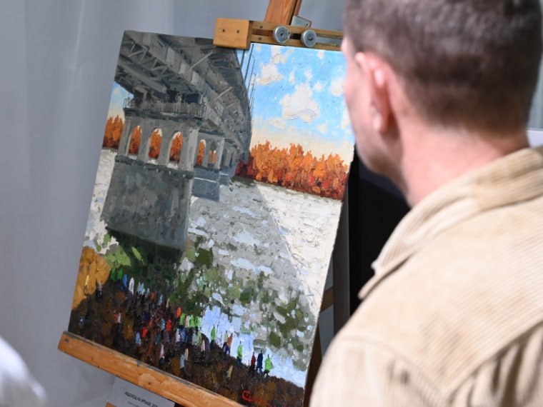 Одна из работ Святослава «Ледоход на Иртыше» – выставлена на экспозиции не в раме, а на мольберте, потому что она создавалась буквально на днях — 12 декабря во время форума «Отдых. Omsk!» в Конгресс-холле. Причем, картина дописывалась прямо на форуме, и его участники откликнулись на просьбу нарисовать себя на холсте. Среди фигурок на берегу можно будет найти губернатора Омской области Виталия Хоценко и акимов Казахстана.