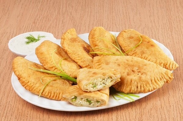 Чебурята выложите на блюдо и украсьте пожелтевшими перами лука. Соус подайте отдельно — это добавит ярких нот к вашему блюду.